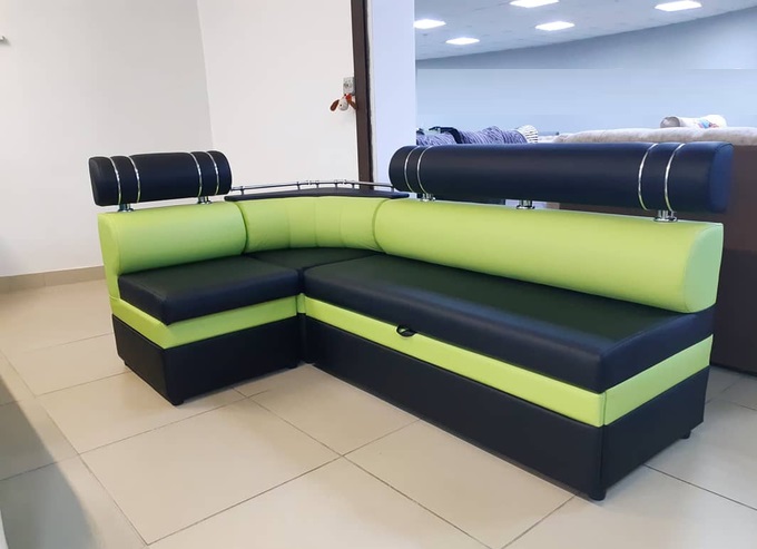 Кухонный уголок в современном стиле. Очень удобная изогнутая спинка, которая способствует комфортному и полноценному отдыху. Дополнительная отдельная полка с хромированными перильцами в стиле Ретро. Ниша для хранения. Универсальность угла.