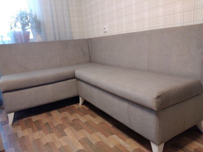 код 113702Мягкий кухонный уголок серого цвета на деревянных опорах. Габариты: 1200х1900х850 мм.
