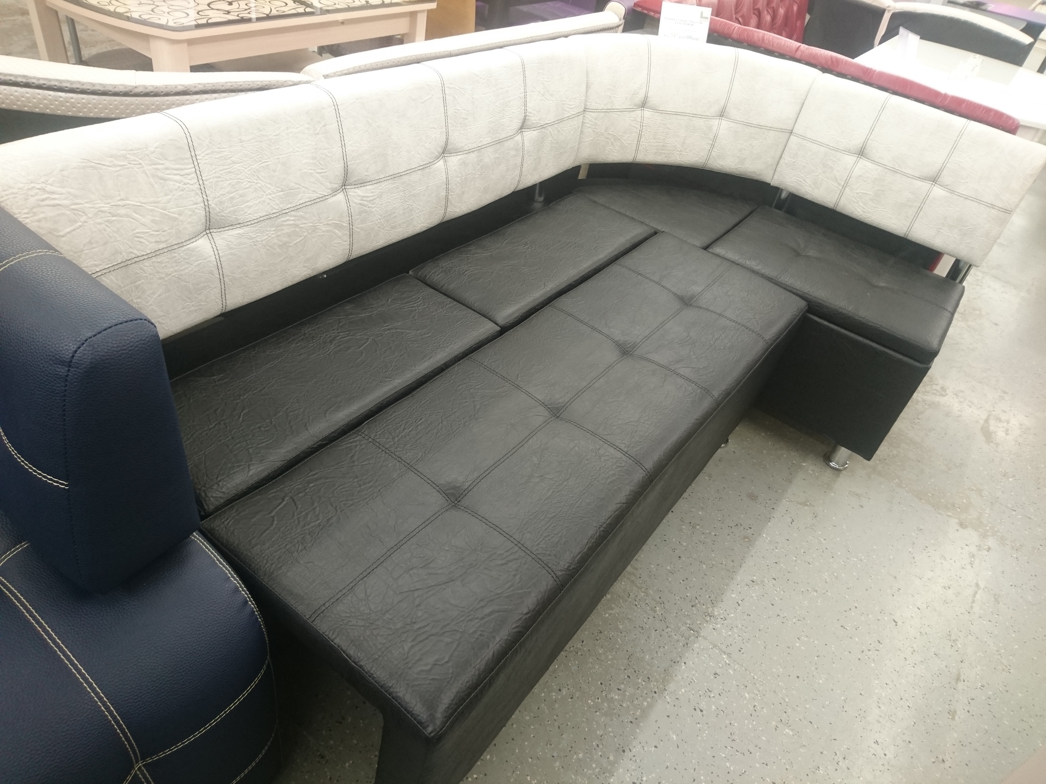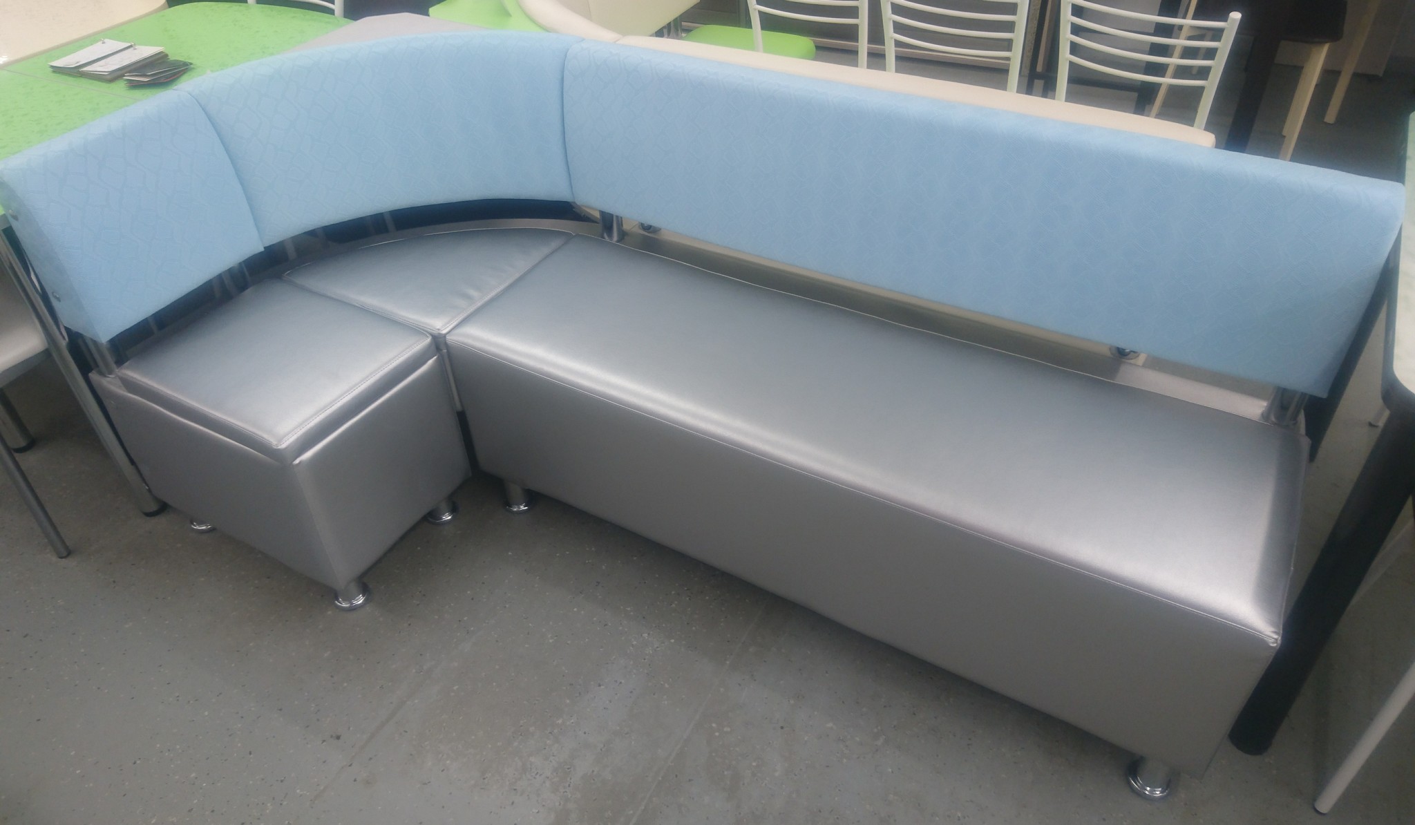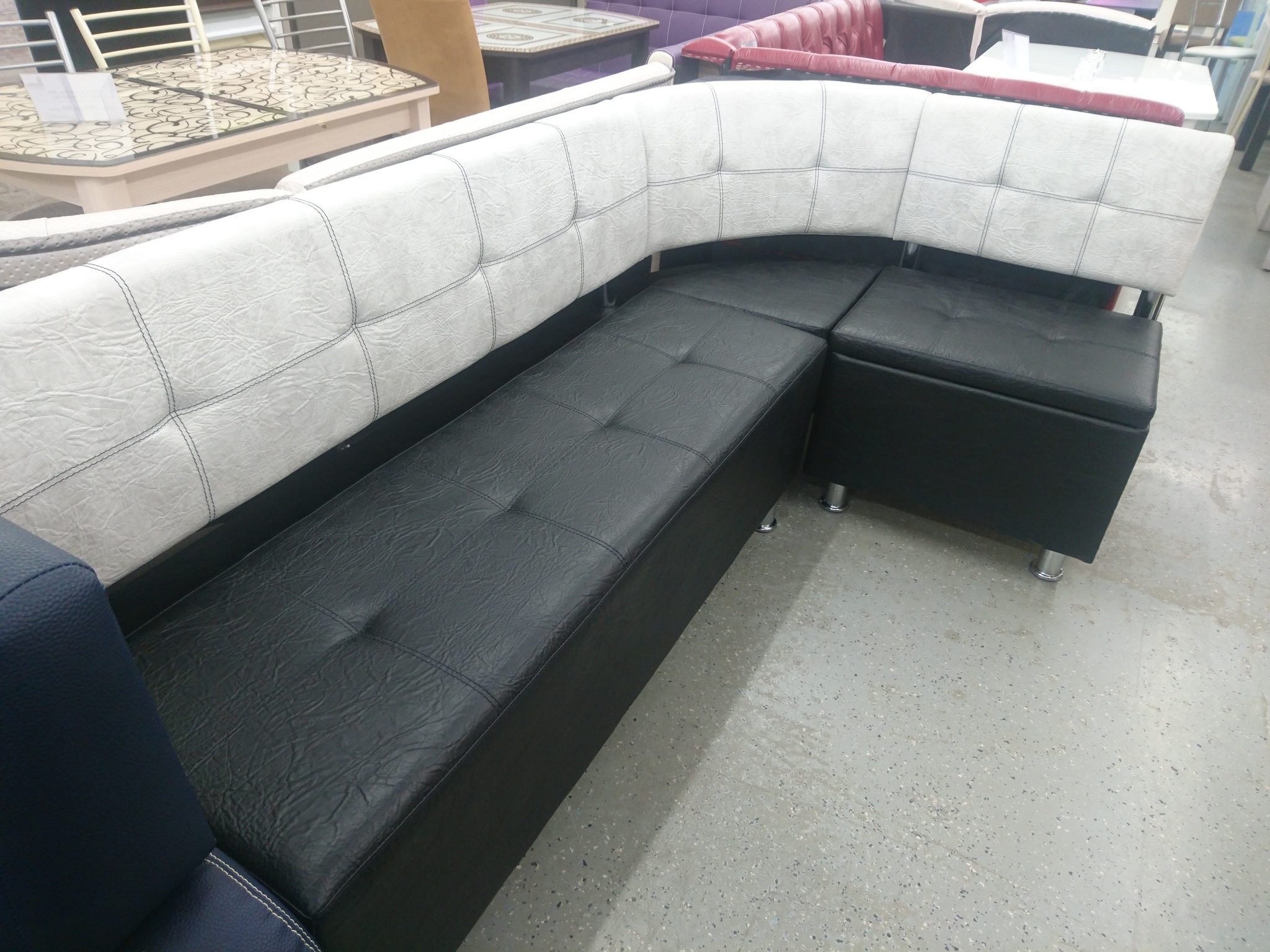 В набор входит: угловая скамья, стол, два табурета. Обивка: экокожа, ткань.
