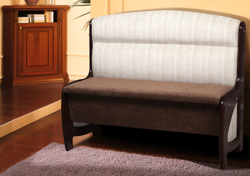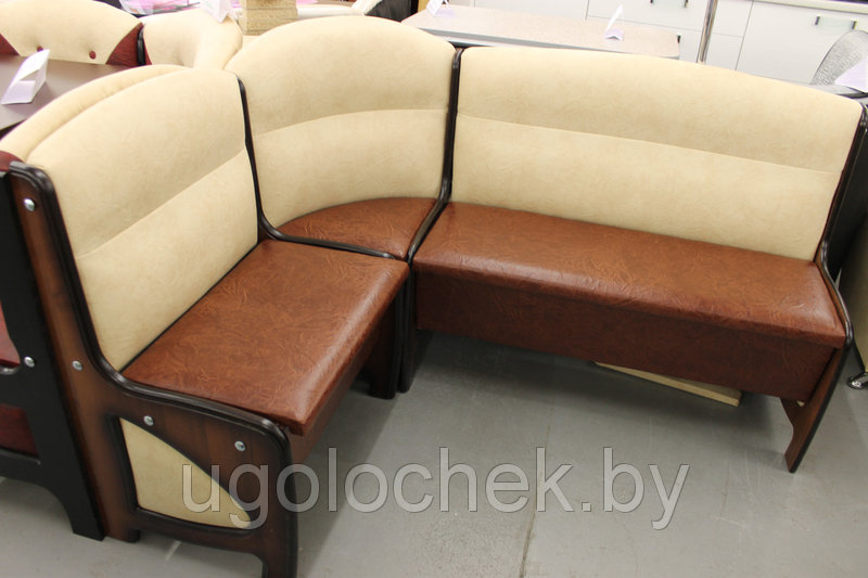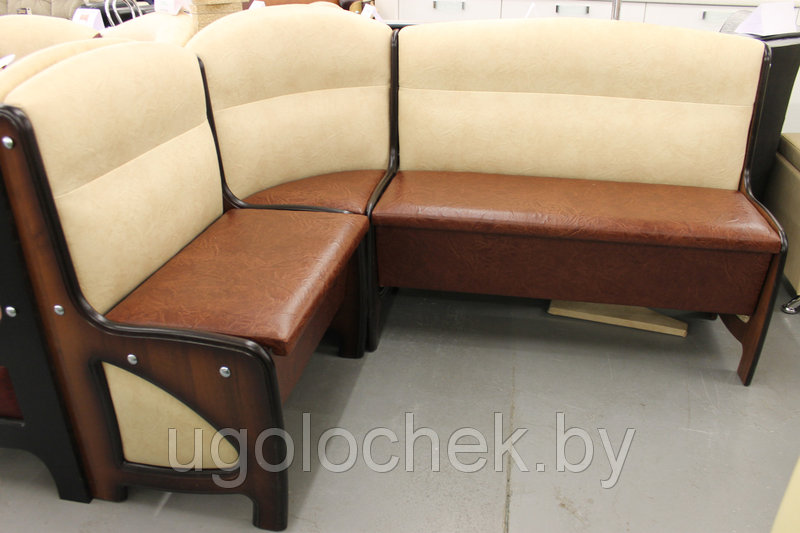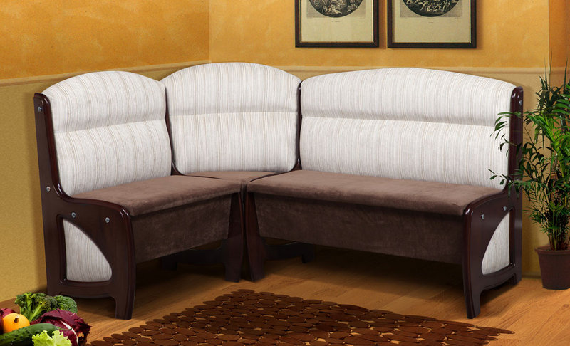Удобная угловая скамья для кухни с легкостью разместит за трапезным столом гостей и домочадцев. Мягкие спинки в тканевой обивке удобны и достаточно просты в уходе. Сиденья и основание в контраст обиты темно-коричневым плотным материалом. Наружный каркас, выступающий по бокам, отделан в темном цвете.