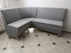 Мягкий кухонный уголок серого цвета на деревянных опорах. Габариты: 1200х1900х850 мм.