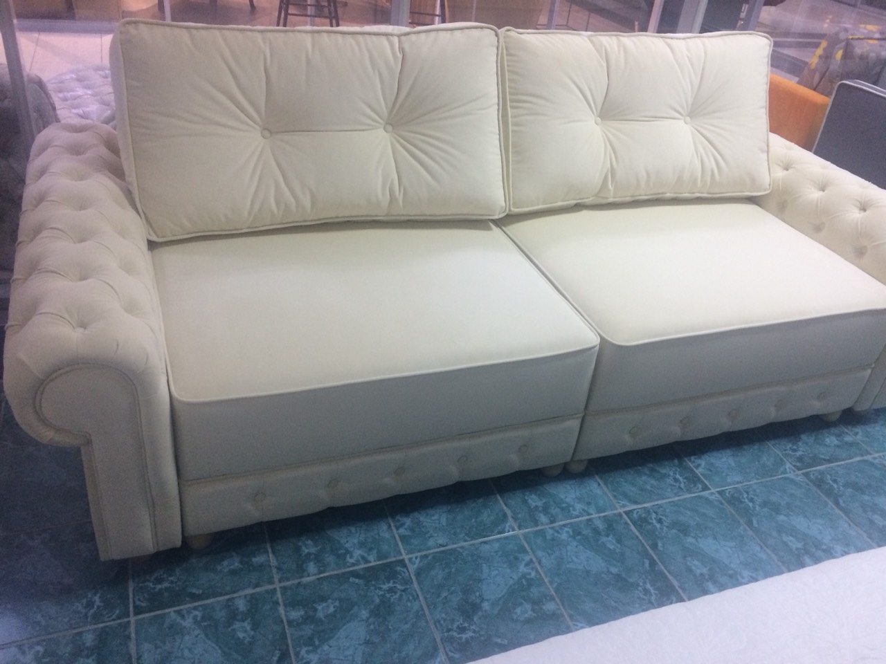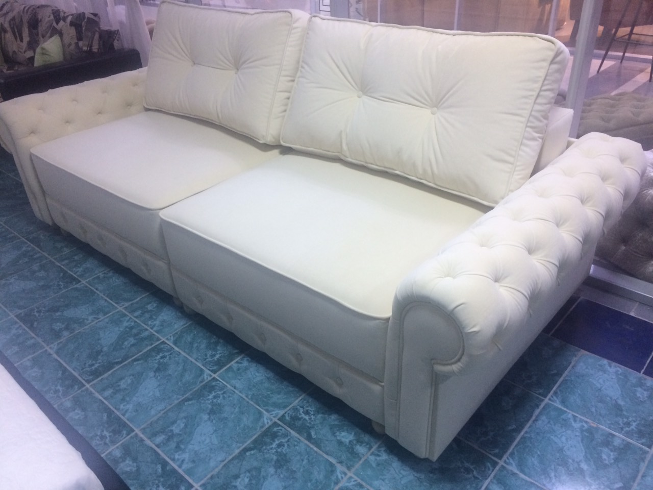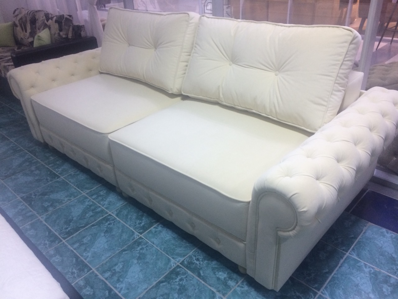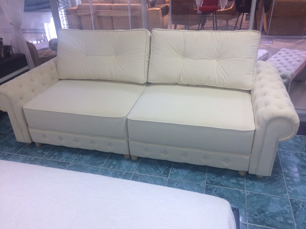 Стильный линейный диван для гостиной комнаты. Спинка дивана представлена в виде двух мягких подушек украшенных пуговками. Фигурные подлокотники и основание дивана декорированы пиковкой. Механизм раскладки позволит быстро трансформировать диван в комфортное спальное место.