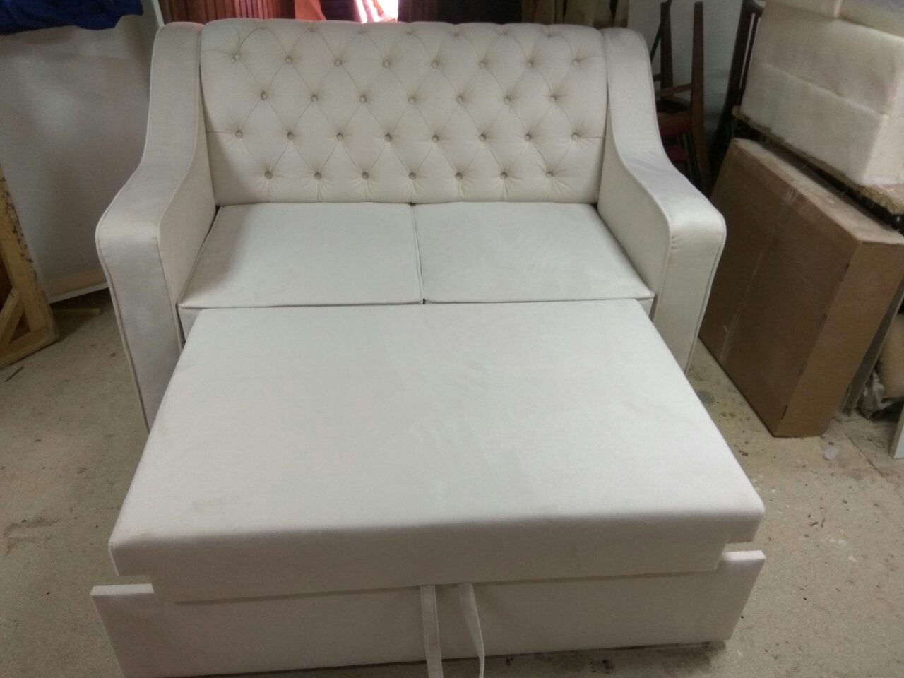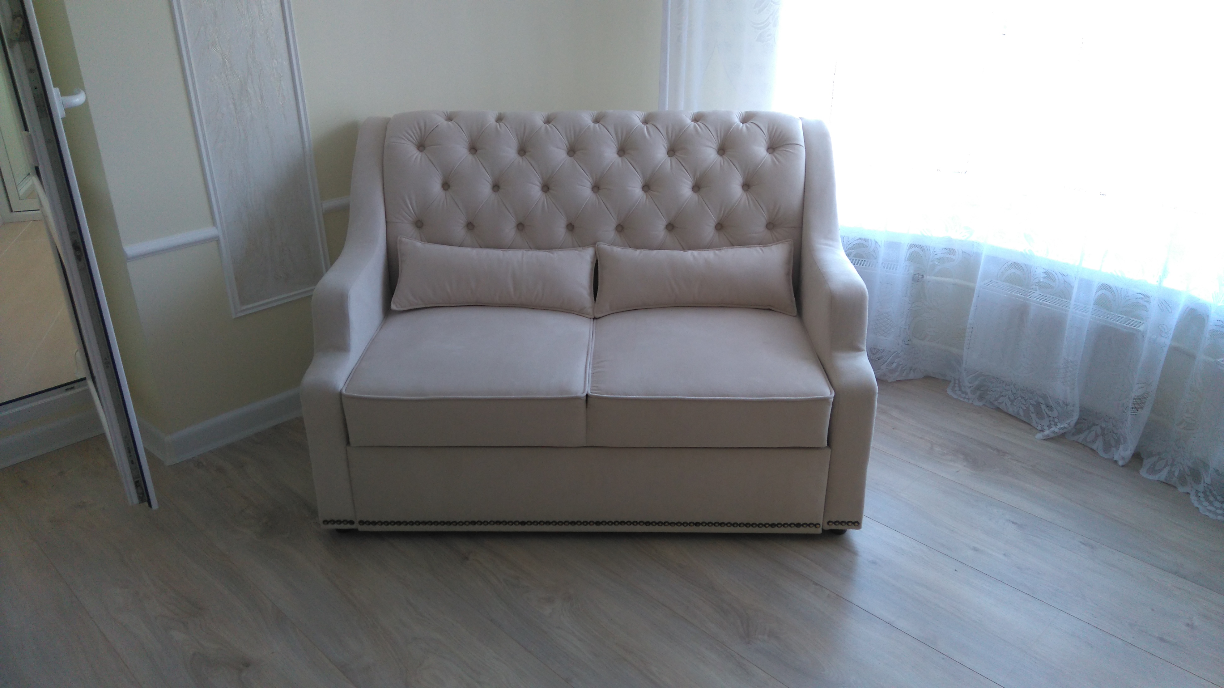 Небольшой раскладной диван с принтом на тему европейской архитектуры.