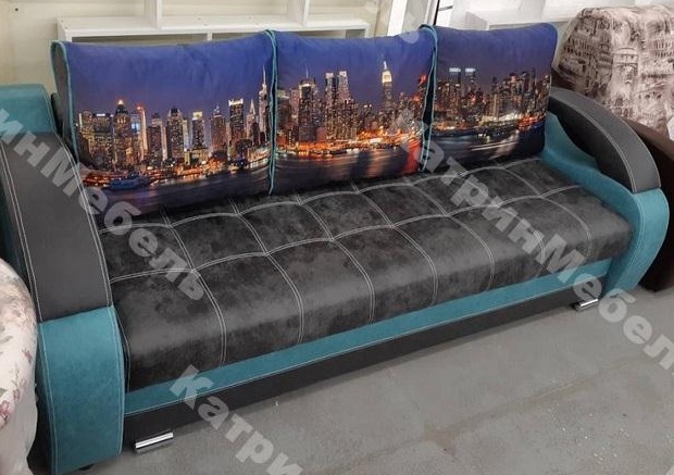 Модель декорирована в комбинации темно-серого и голубого лазурного оттенка с принтованными подушками.