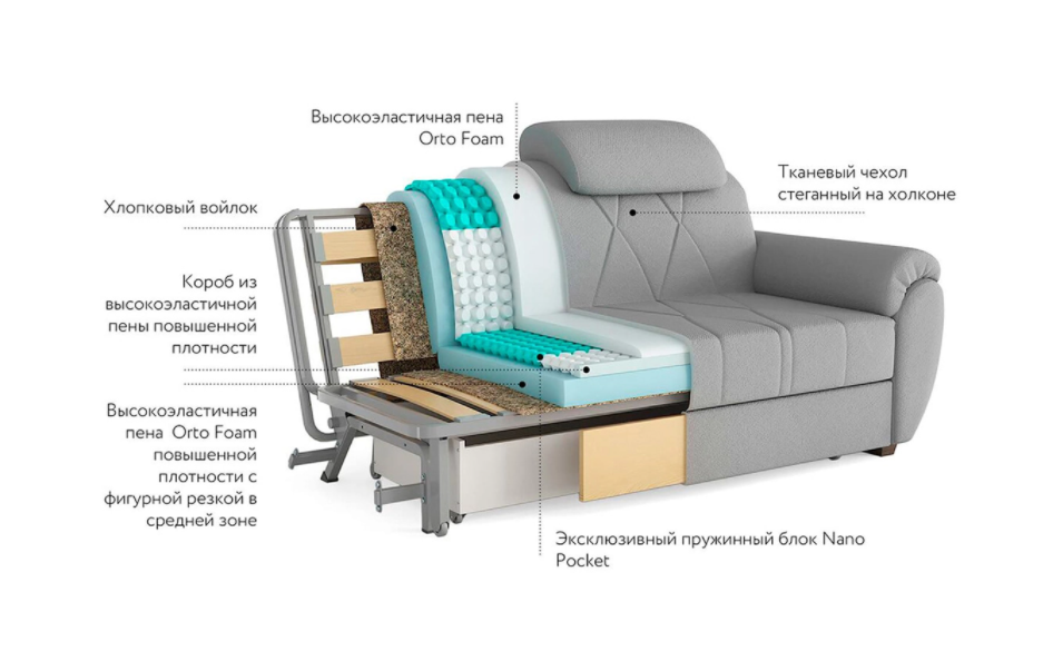 В основе дивана – высокий матрас, уникальный для такого вида трансформации. 7-зональный пружинный блок NanoPocket (блок независимых пружин высотой 2,5 см) поддерживает позвоночник в анатомически правильном положении, способствует комфортному расслаблению.