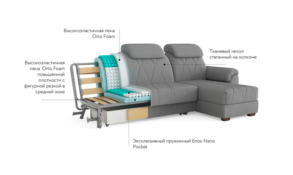 В основе дивана – высокий матрас, уникальный для такого вида трансформации. 7-зональный пружинный блок NanoPocket (блок независимых пружин высотой 2,5 см) поддерживает позвоночник в анатомически правильном положении, способствует комфортному расслаблению.