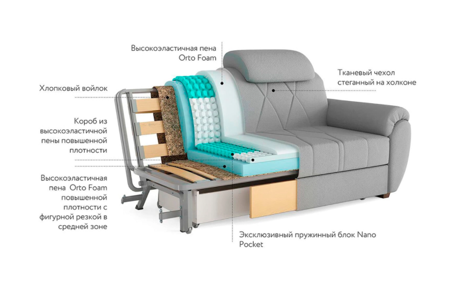 В основе дивана – высокий матрас, уникальный для такого вида трансформации. 7-зональный пружинный блок NanoPocket (блок независимых пружин высотой 2,5 см) поддерживает позвоночник в анатомически правильном положении, способствует комфортному расслаблению.