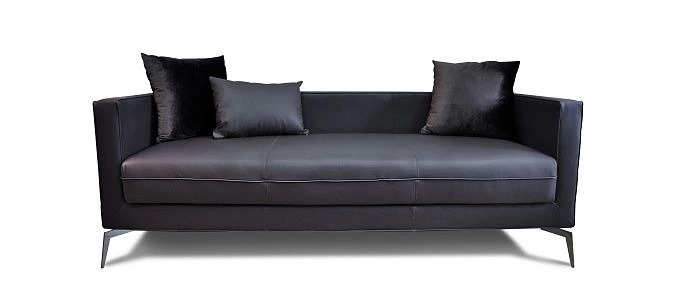 Прямой трехместный диван «Антонио» – это строгие геометрические формы, отсутствие изгибов и замысловатой отделки (черты, характерные для минимализма и модерна). В качестве декора использованы фактурные подушки из матовой ткани с металлическим отливом. Несмотря на простоту дизайна, прямой диван «Антонио» отличается изяществом и легкостью, которая достигается за счет ножек необычной формы. Изогнутые под прямым углом, они создают визуальный эффект будто зависающего над полом дивана.