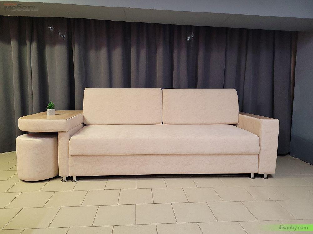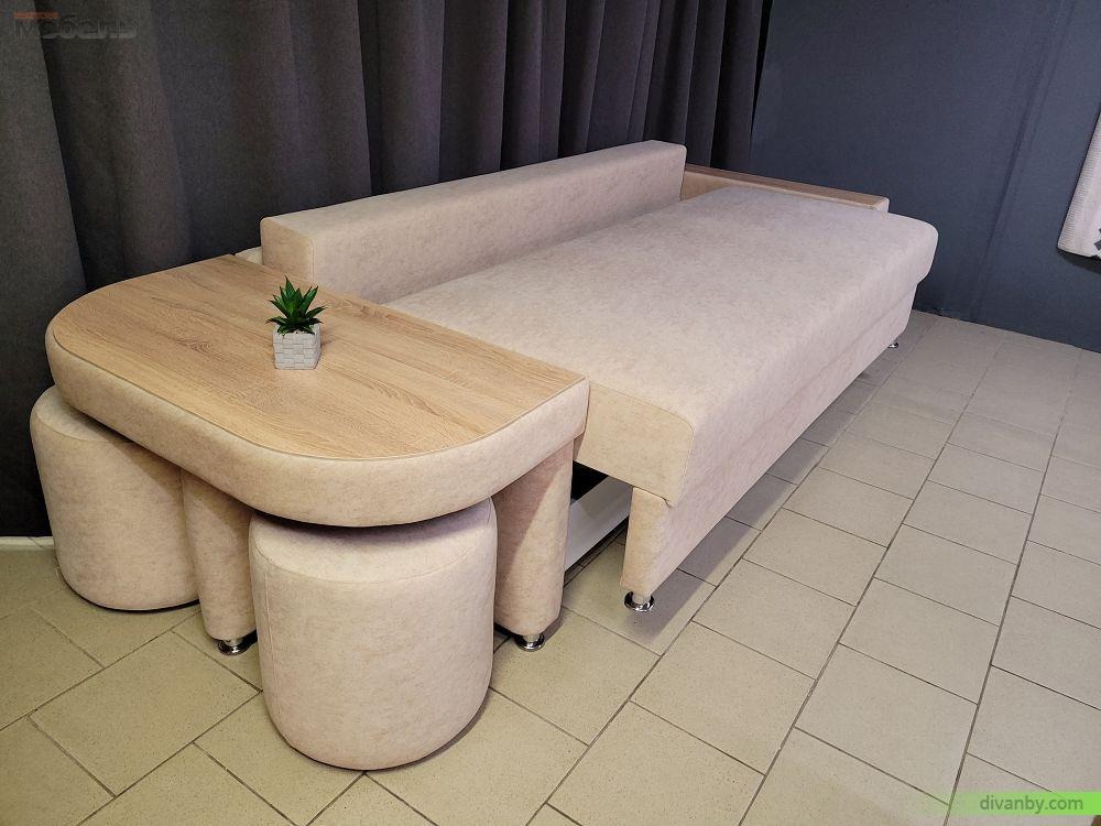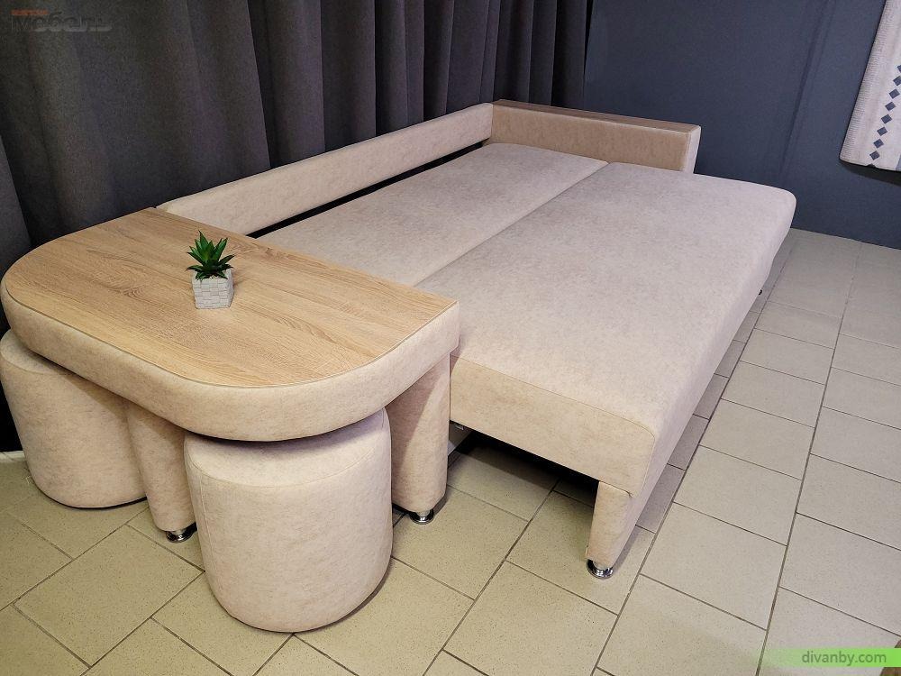 Удобный диван для отдыха и ежедневного сна. Механизм трансформации Тик-так позволяет быстро превратить диван в просторную кровать с упругим матрасом. Модель оснащена ящиком для хранения белья, а также оборудована столиком в комплекте с двумя удобными банкетками, что значительно расширяет функциональные возможности дивана.