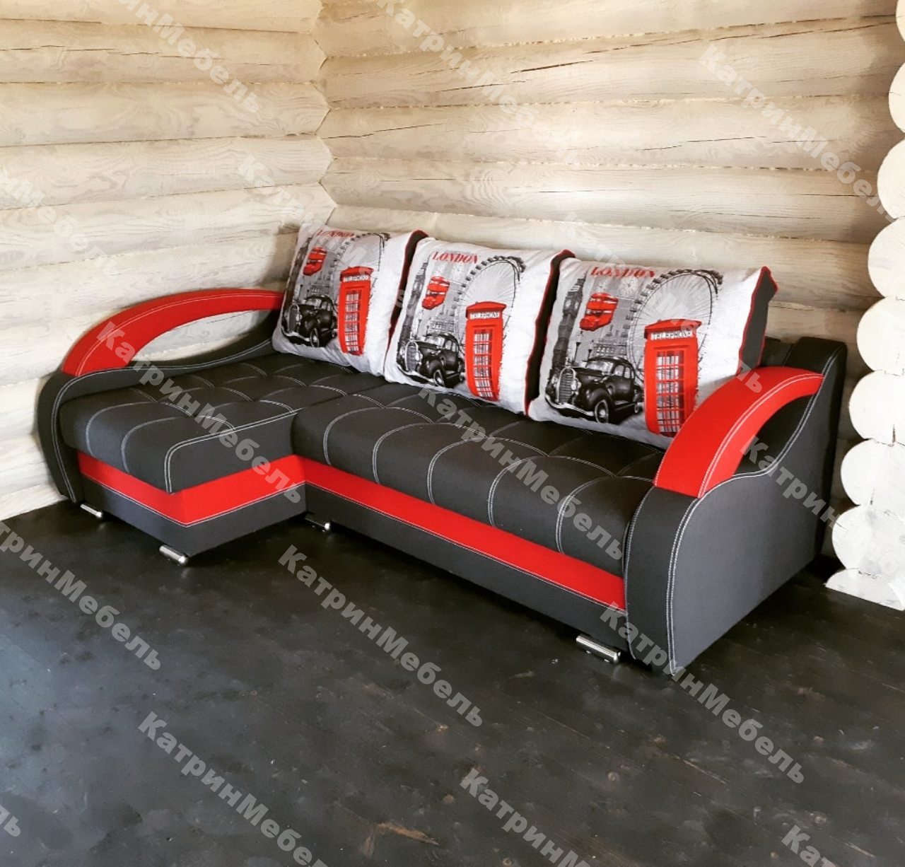 Диван «Байрон» выполнен в ярком дизайне. Броский красный цвет обивки приглушает темный серый. Отличным дополнением являются белая прострочка, делая квадратный рисунок на поверхности, и три подушки под спину с фотопринтом.