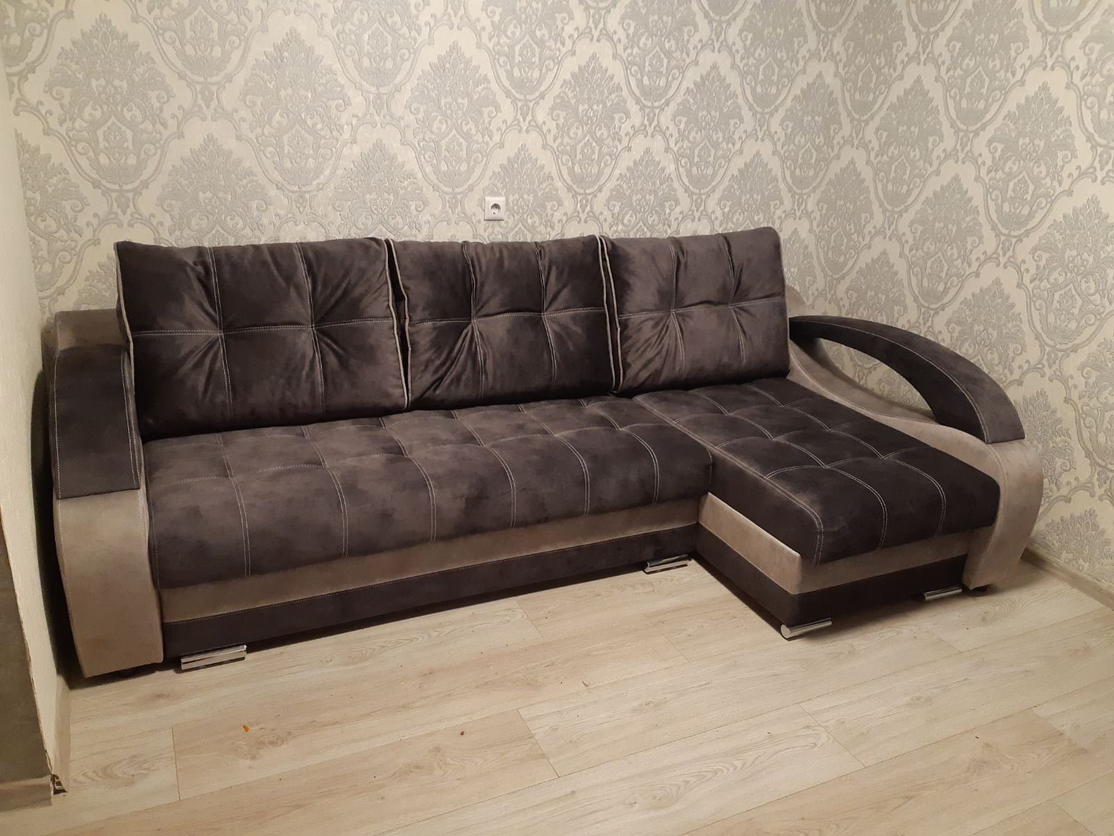 Угловой диван серого цвета с декоративными подушками.