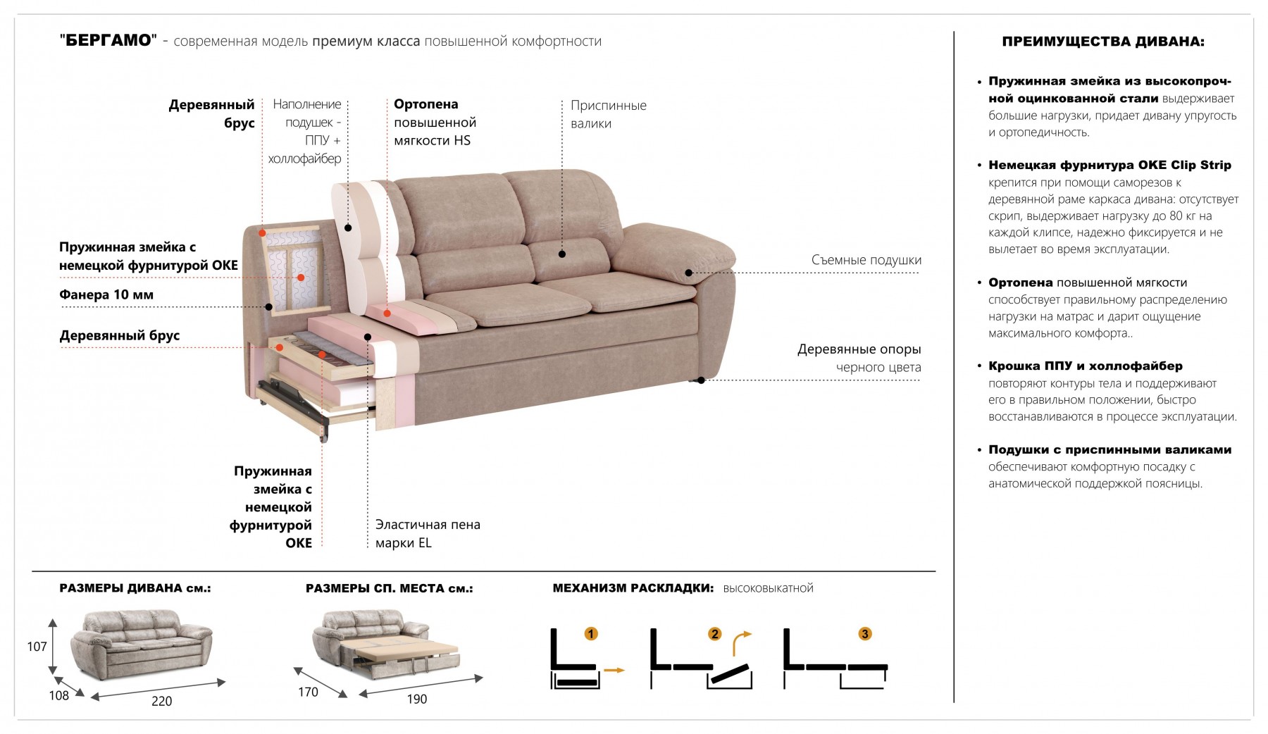 Габариты: 270x185x85 см. Наполнитель: Пружинный блок «змейка».
