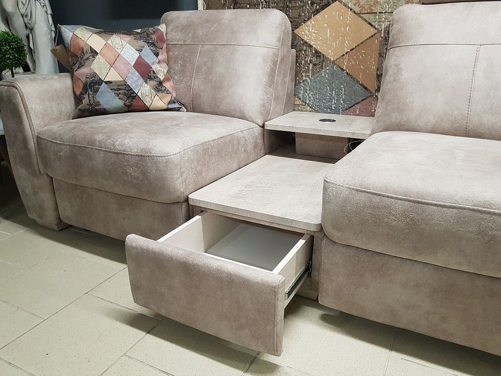 - вариант 1: соединительный модуль-подлокотник оснащается подвижной накладкой, внутри ниша, подсветка, встроенный держатель для бутылок, розетка на 220V и два USB входа;
