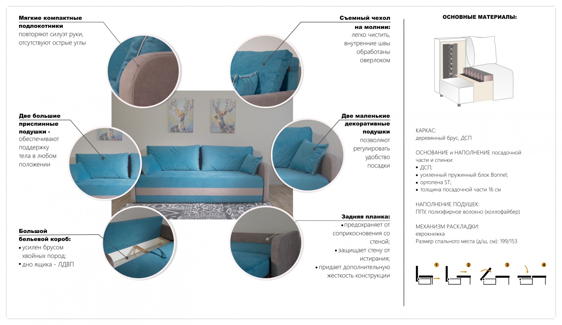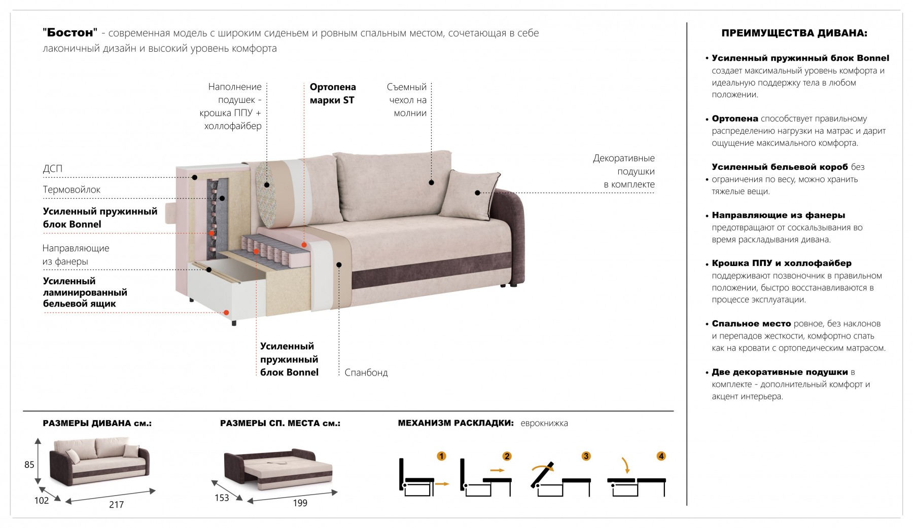 Спальное место: 1900 х 1300 мм. Общий габарит: 2000 х 900 мм. Механизм раскладки: еврокнижка.