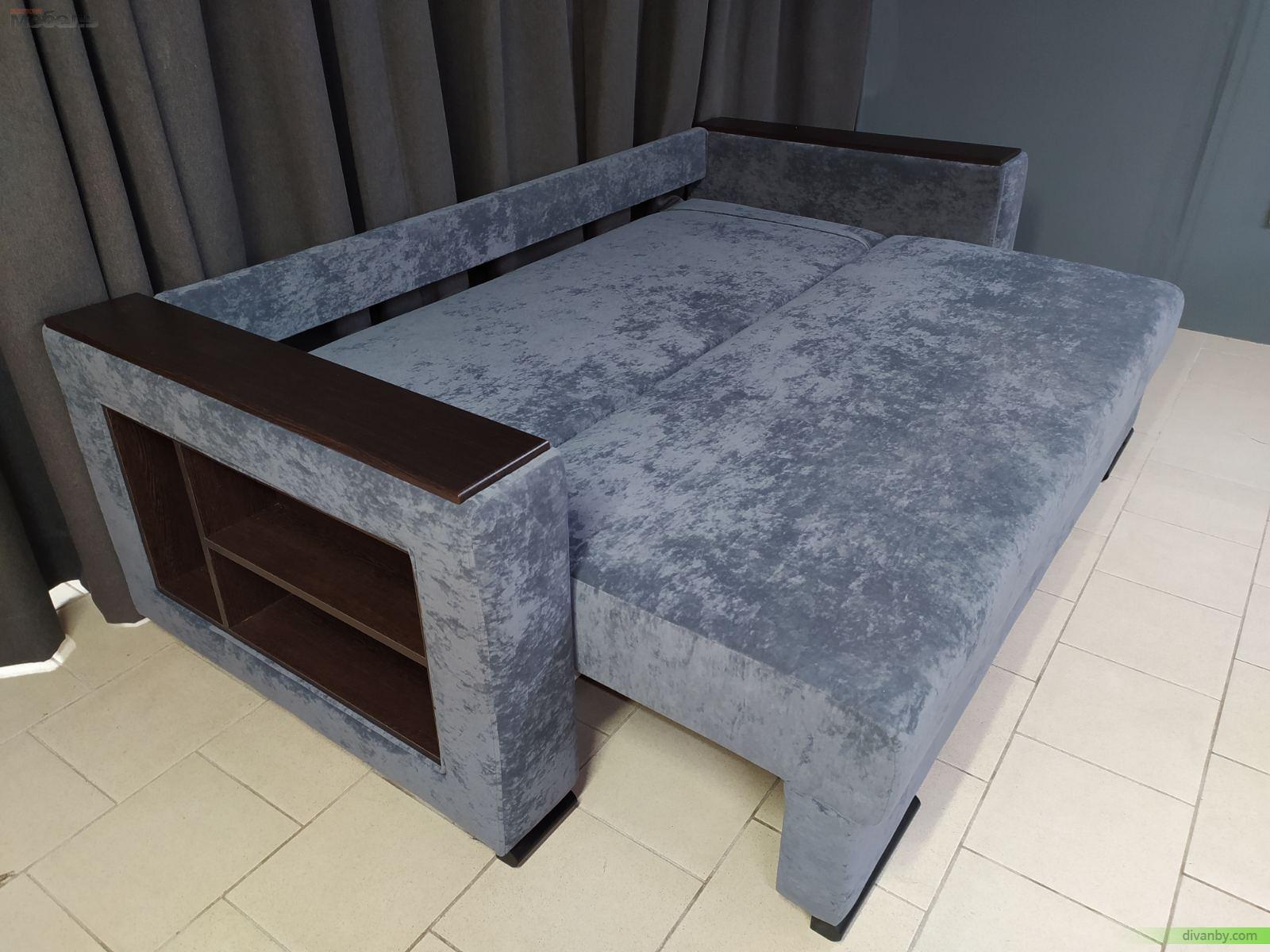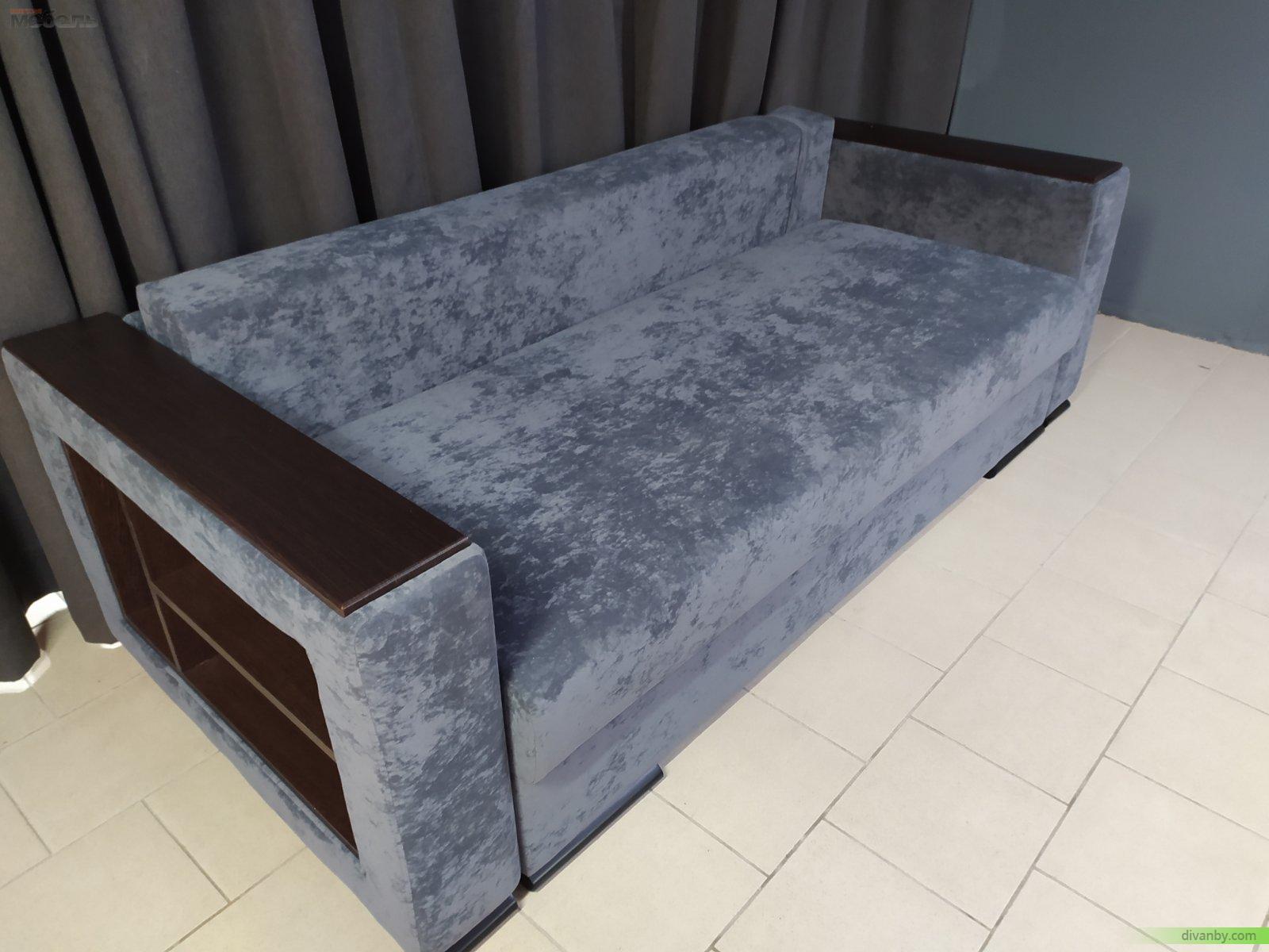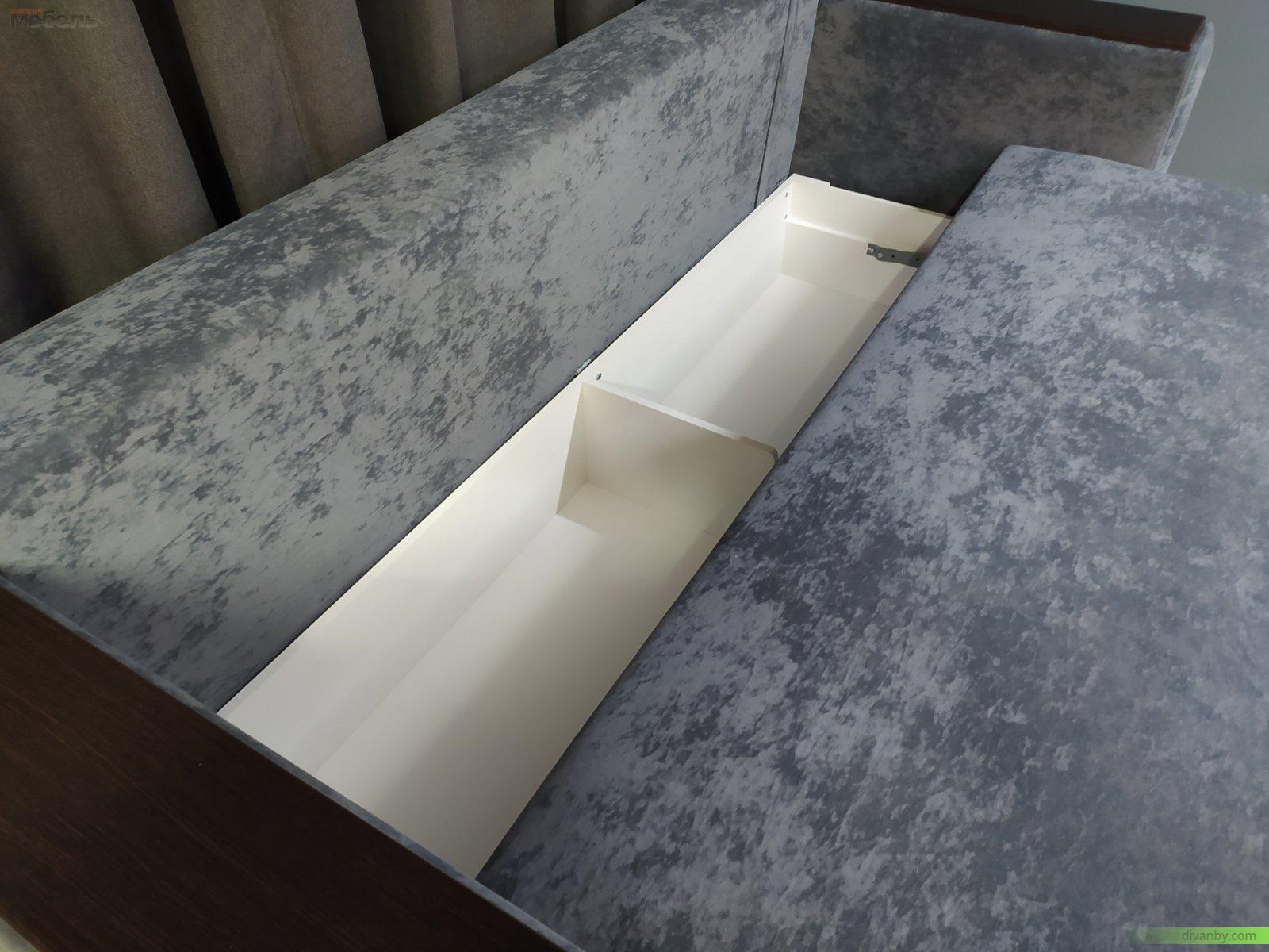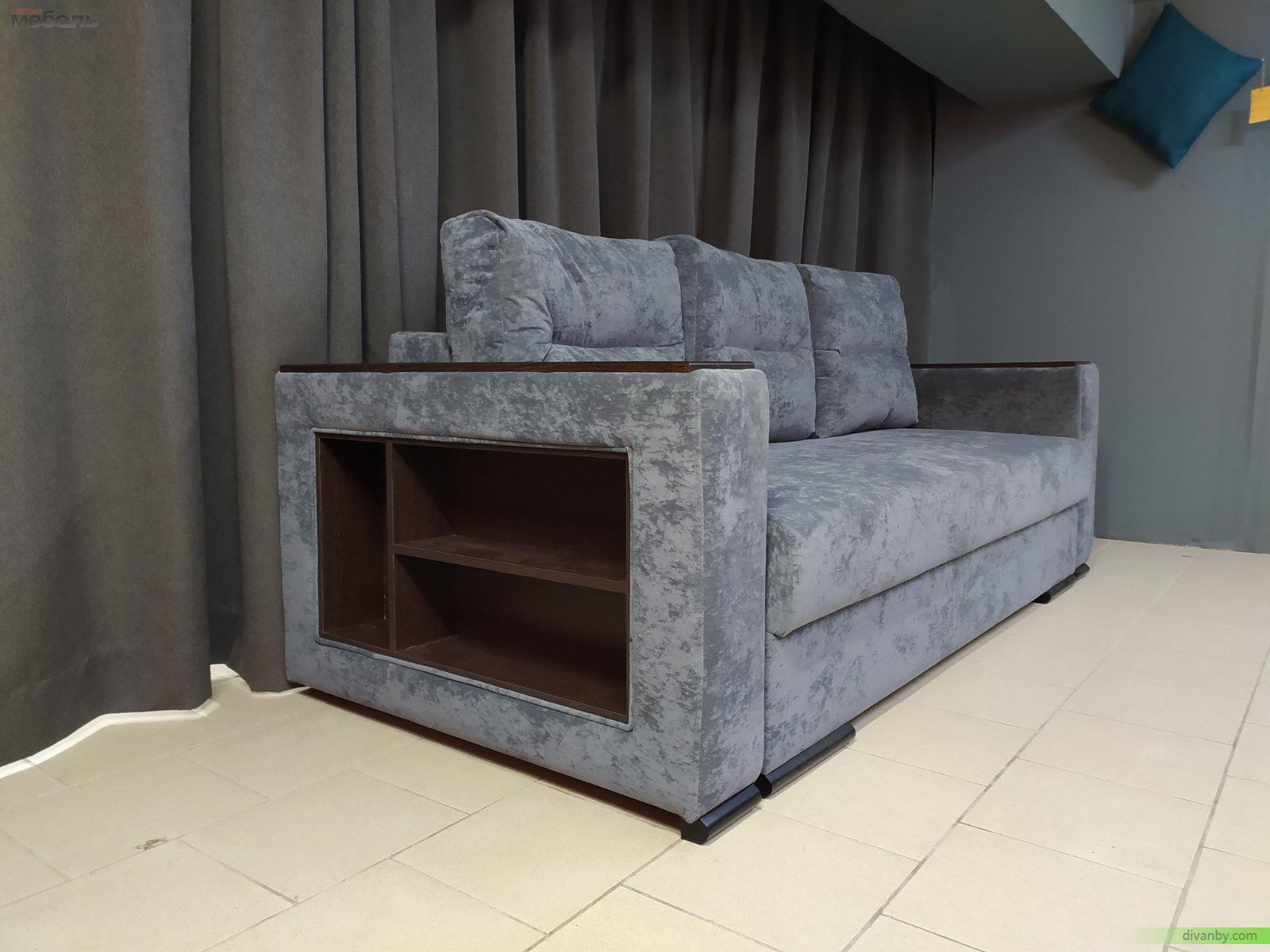 Современный стиль с серой велюровой обивкой. Полки в боковинах.