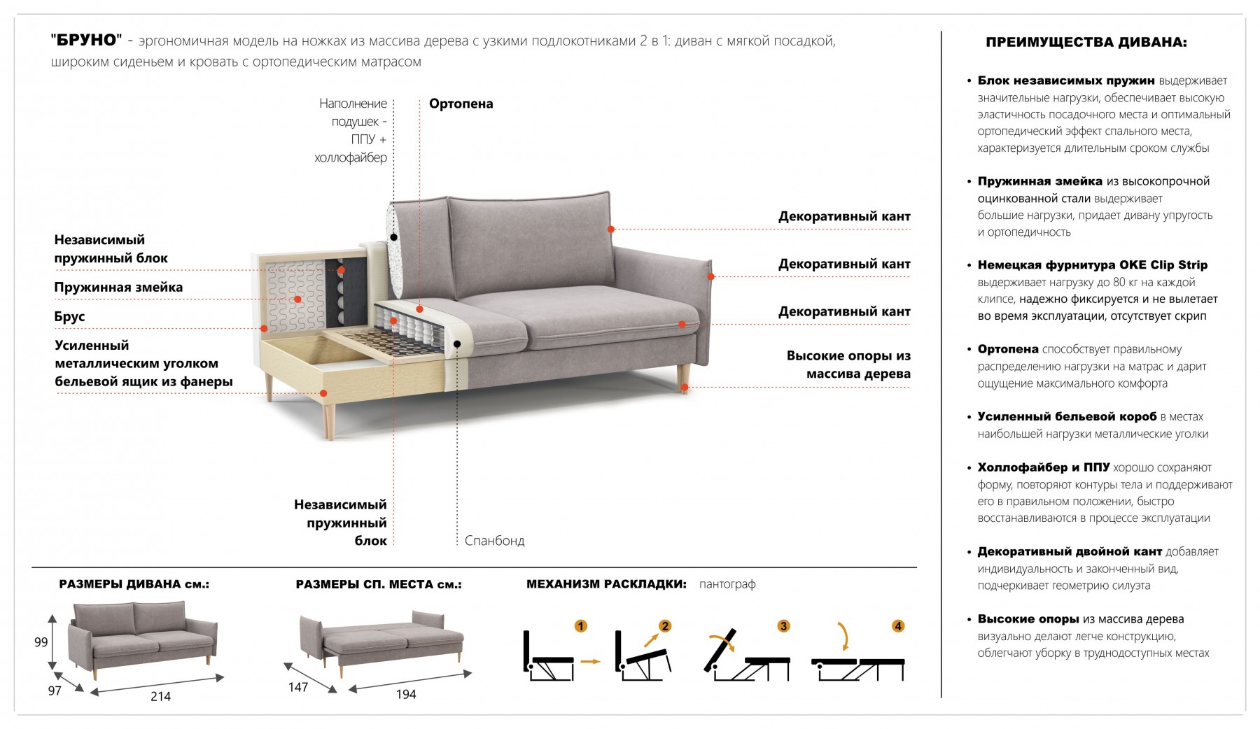 Габариты (ДхШхВ): 258х162х98 см. Блок независимых пружин. Механизм: «Еврокнижка».