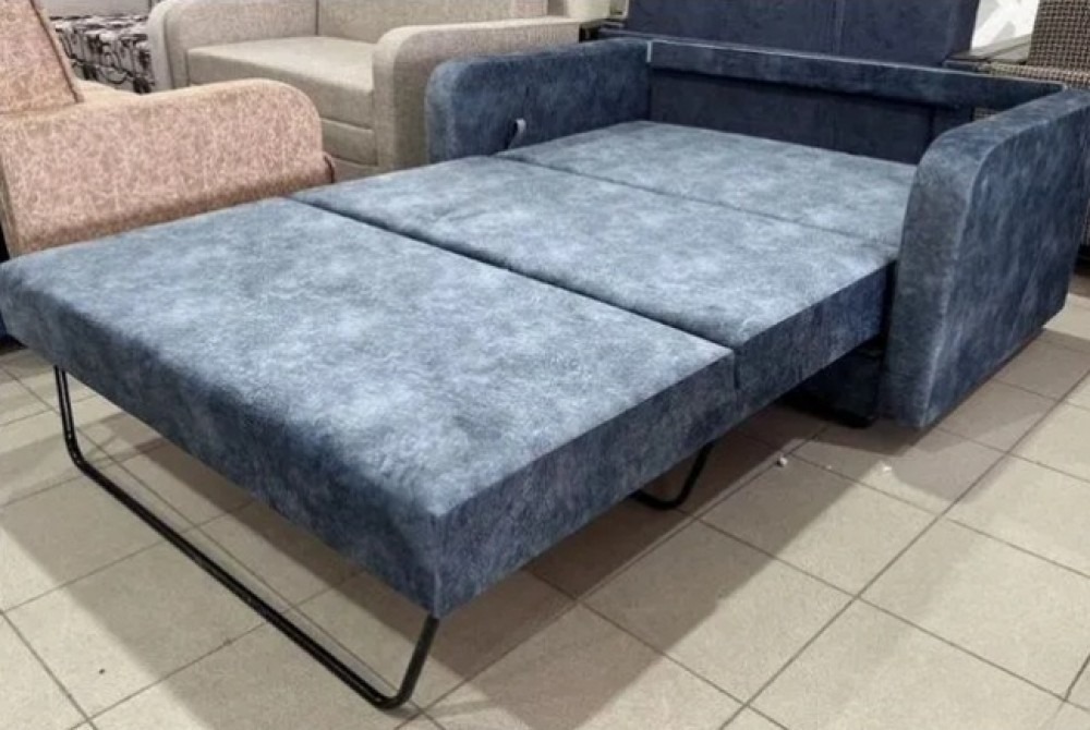 Компактный раскладной диван с округлыми подлокотниками.