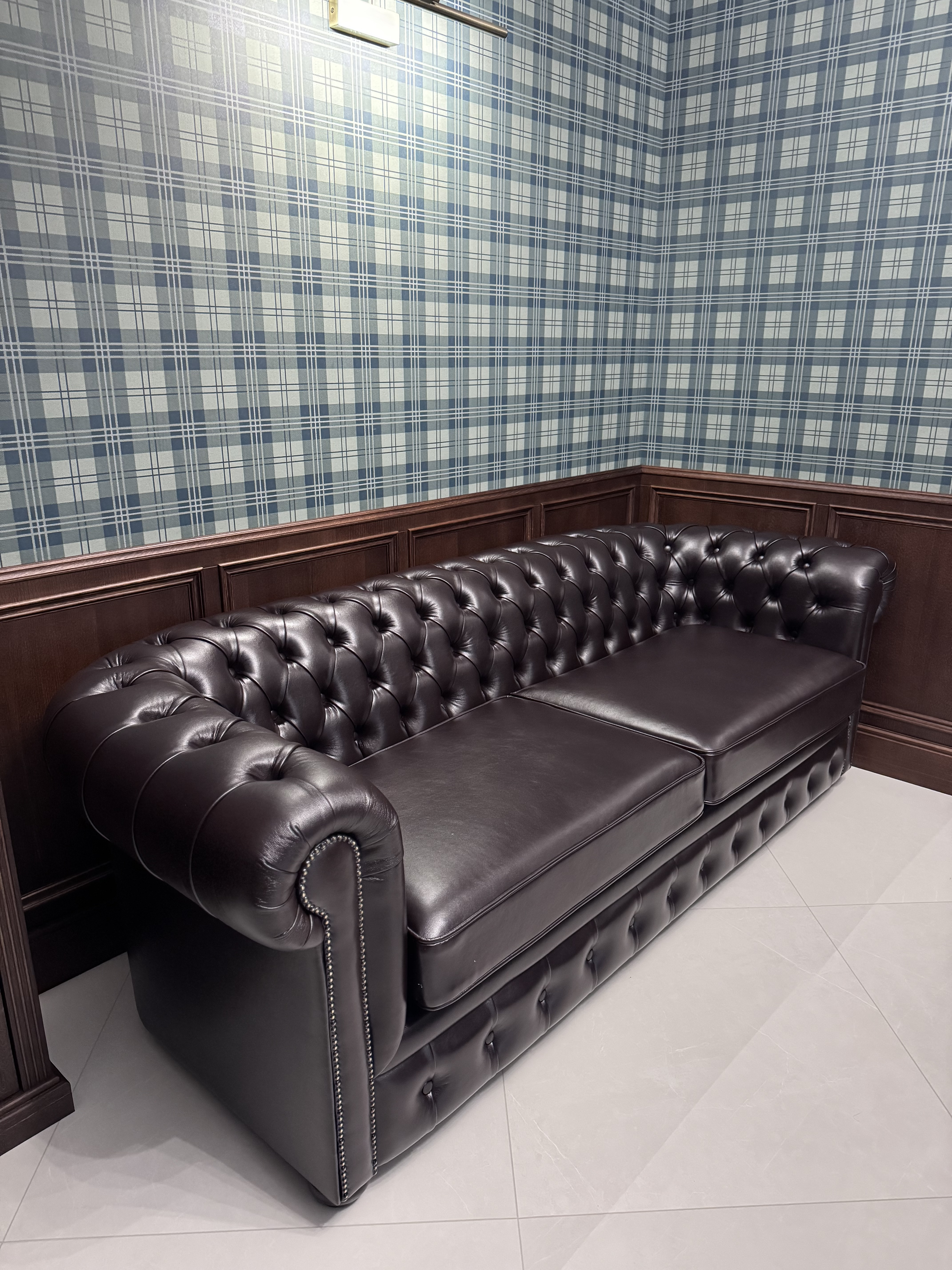 Диван в классическом английском стиле с узнаваемой стеганой спинкой и подлокотниками.