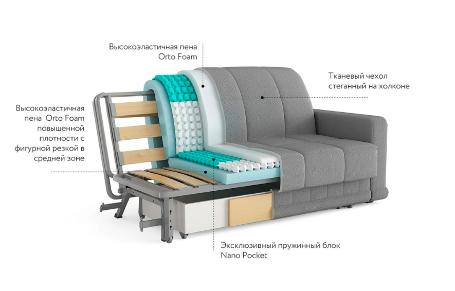В основе дивана – высокий матрас, уникальный для такого вида трансформации. 7-зональный пружинный блок NanoPocket (блок независимых пружин высотой 2,5 см) поддерживает позвоночник в анатомически правильном положении, способствует комфортному расслаблению.