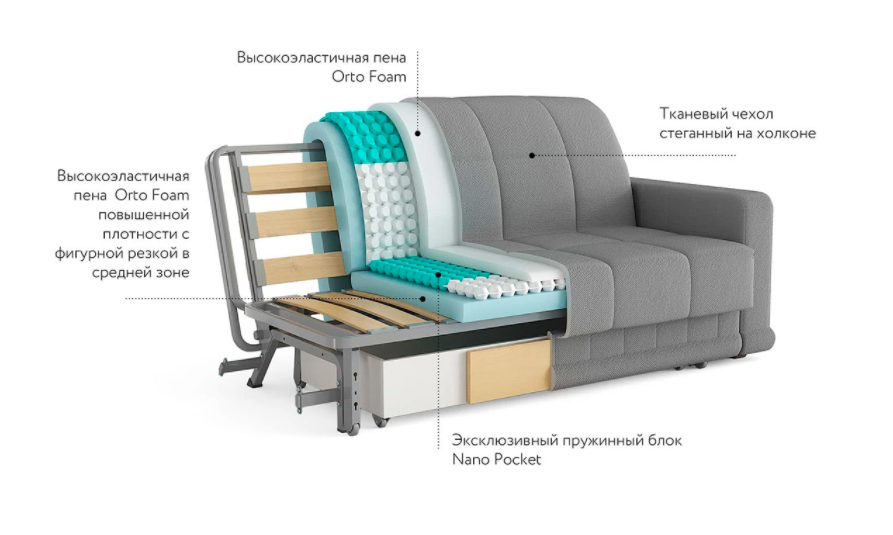 В основе дивана – высокий матрас, уникальный для такого вида трансформации. 7-зональный пружинный блок NanoPocket (блок независимых пружин высотой 2,5 см) поддерживает позвоночник в анатомически правильном положении, способствует комфортному расслаблению.