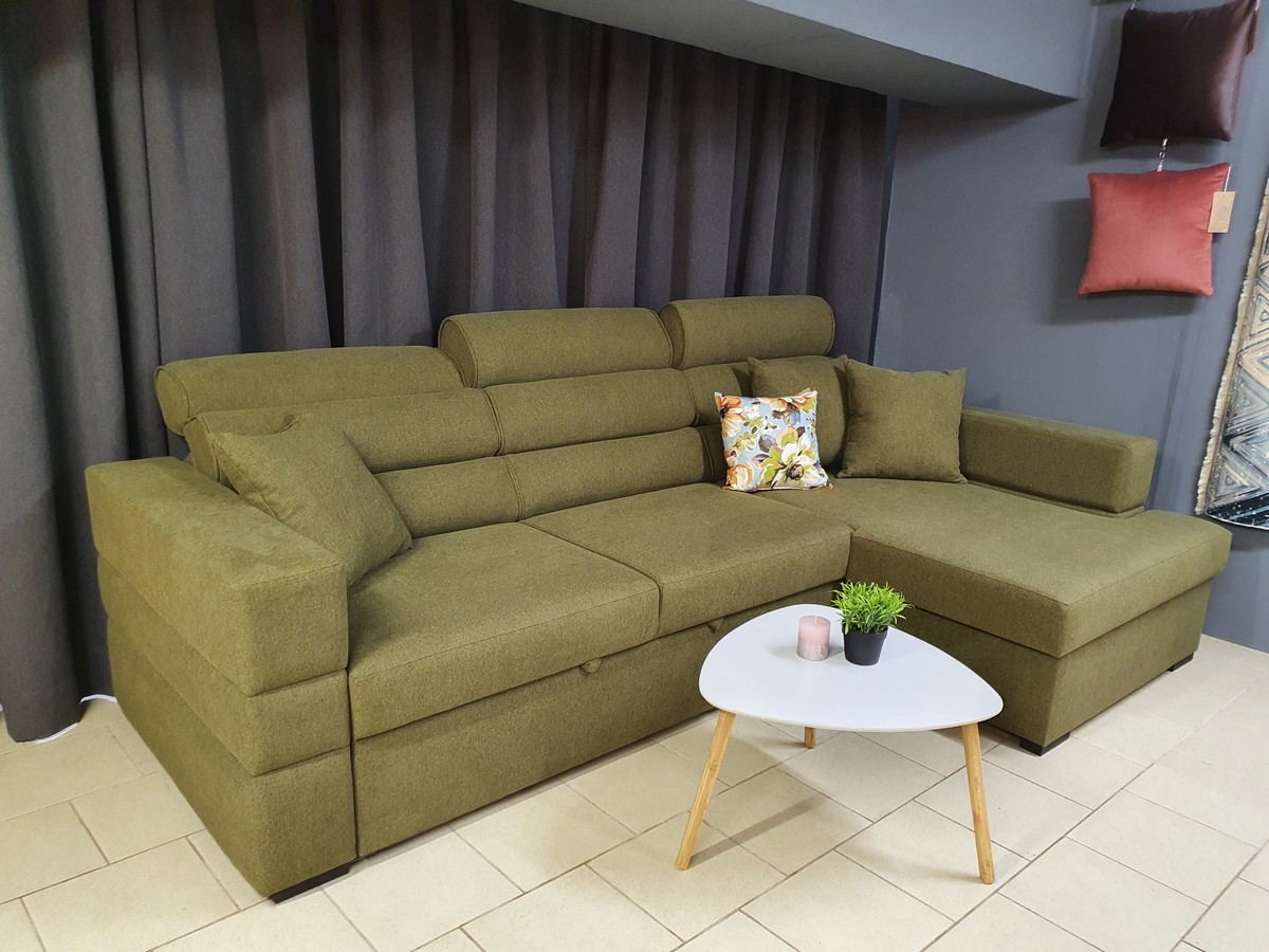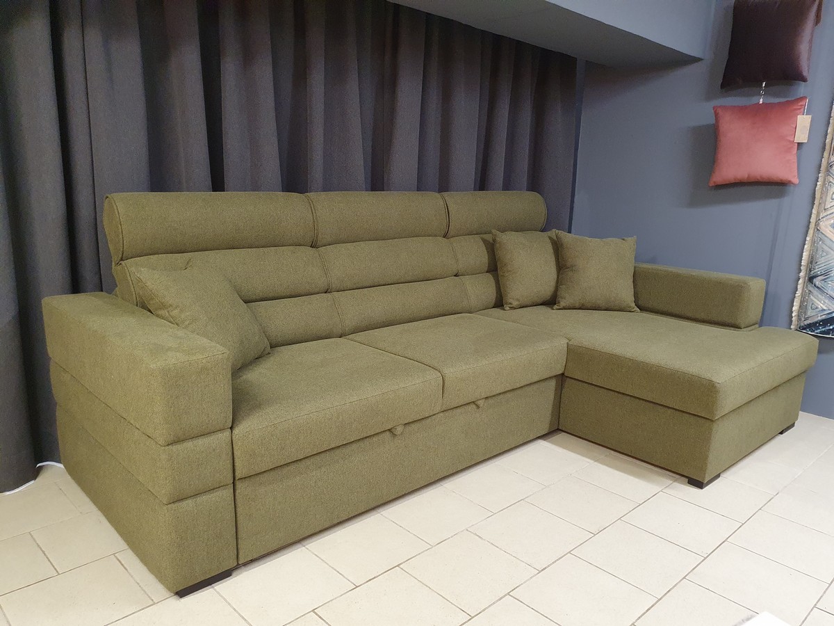Диван с металлической фурнитурой, различными вариантами обивки и ящиком для постельного белья.