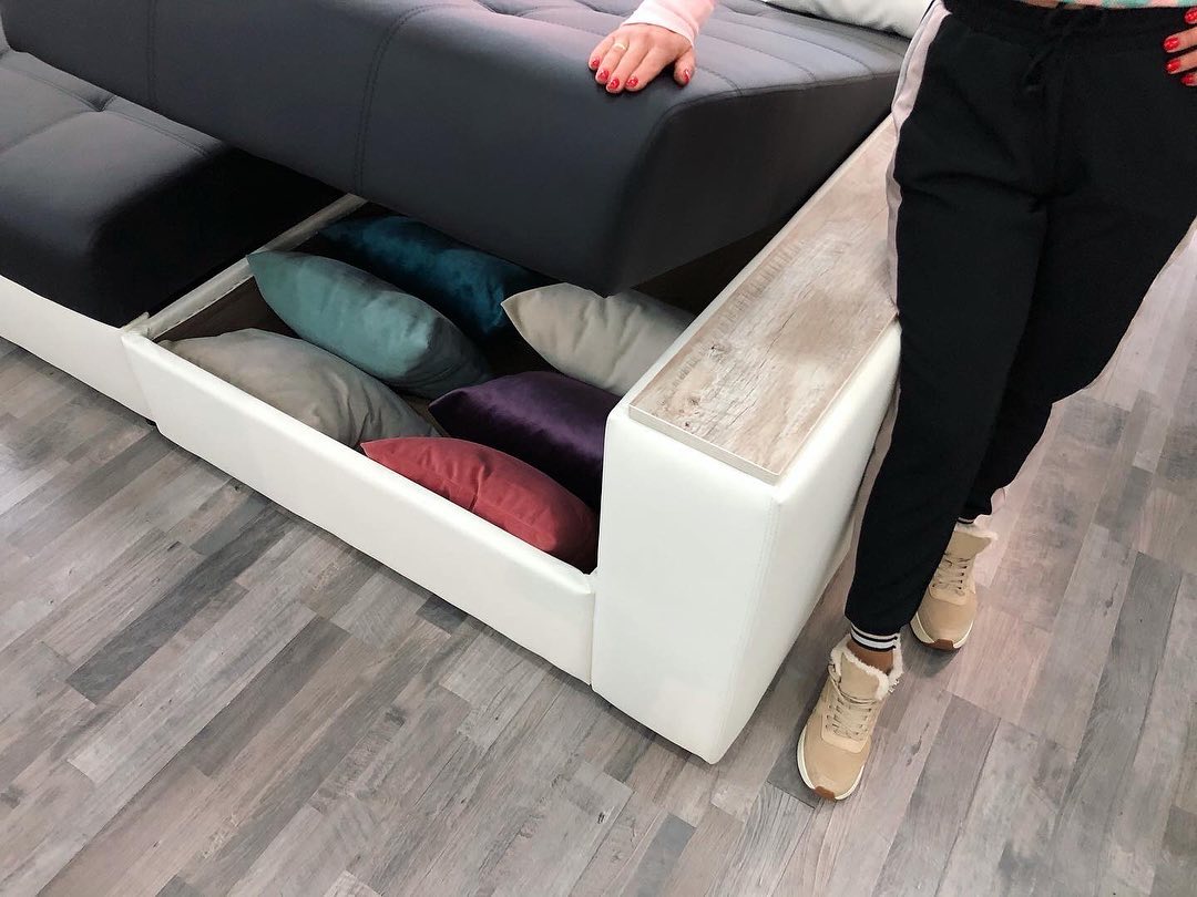 Две декоративные подушки, хромированные опоры, ящик для хранения.
