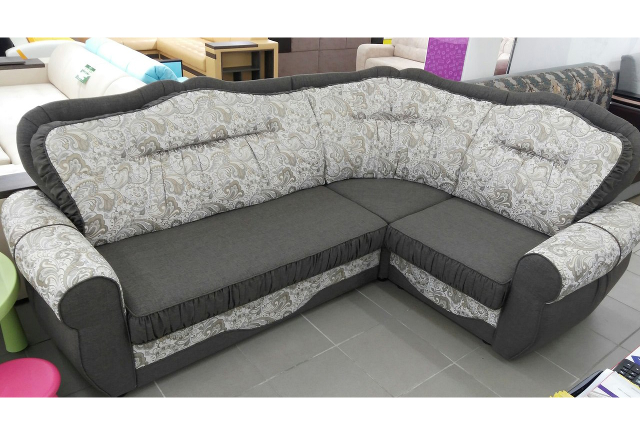 Угловой уютный диван. Обивка представлена сочетанием тканей графитового оттенка и с серым рисунком на белом фоне. Мягкие подлокотники и фигурная спинка.