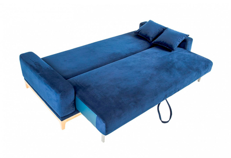 Хромированные опоры, большое спальное место, спинки-подушки, бельевой ящик.