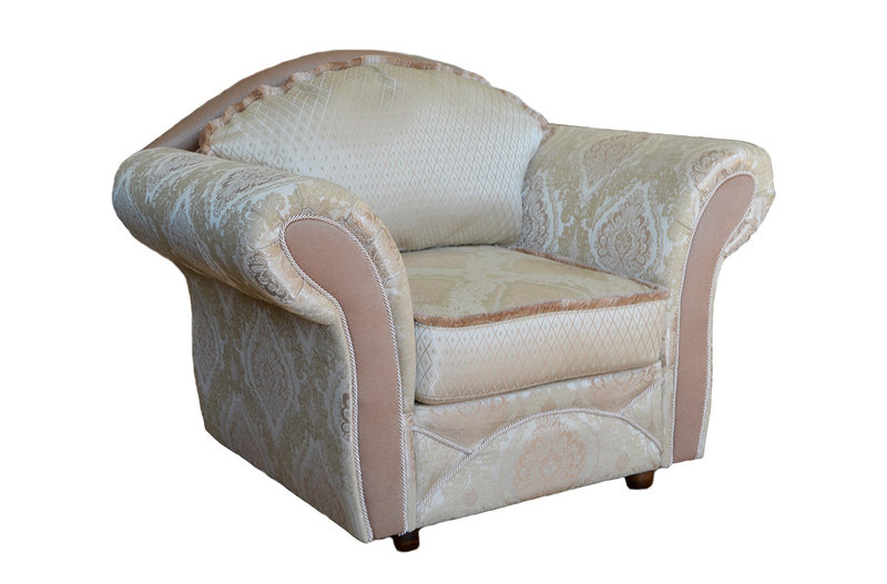 Трехместный прямой диван со спинкой ракушкой и слегка отогнытыми мягкими подлокотниками валиком обит светлой жаккардовой тканью бело-бежевых тонов. Многочисленные подушки спинки и сиденья декорированы кантом. Лицевая часть основания и боковин с декоративными швами.