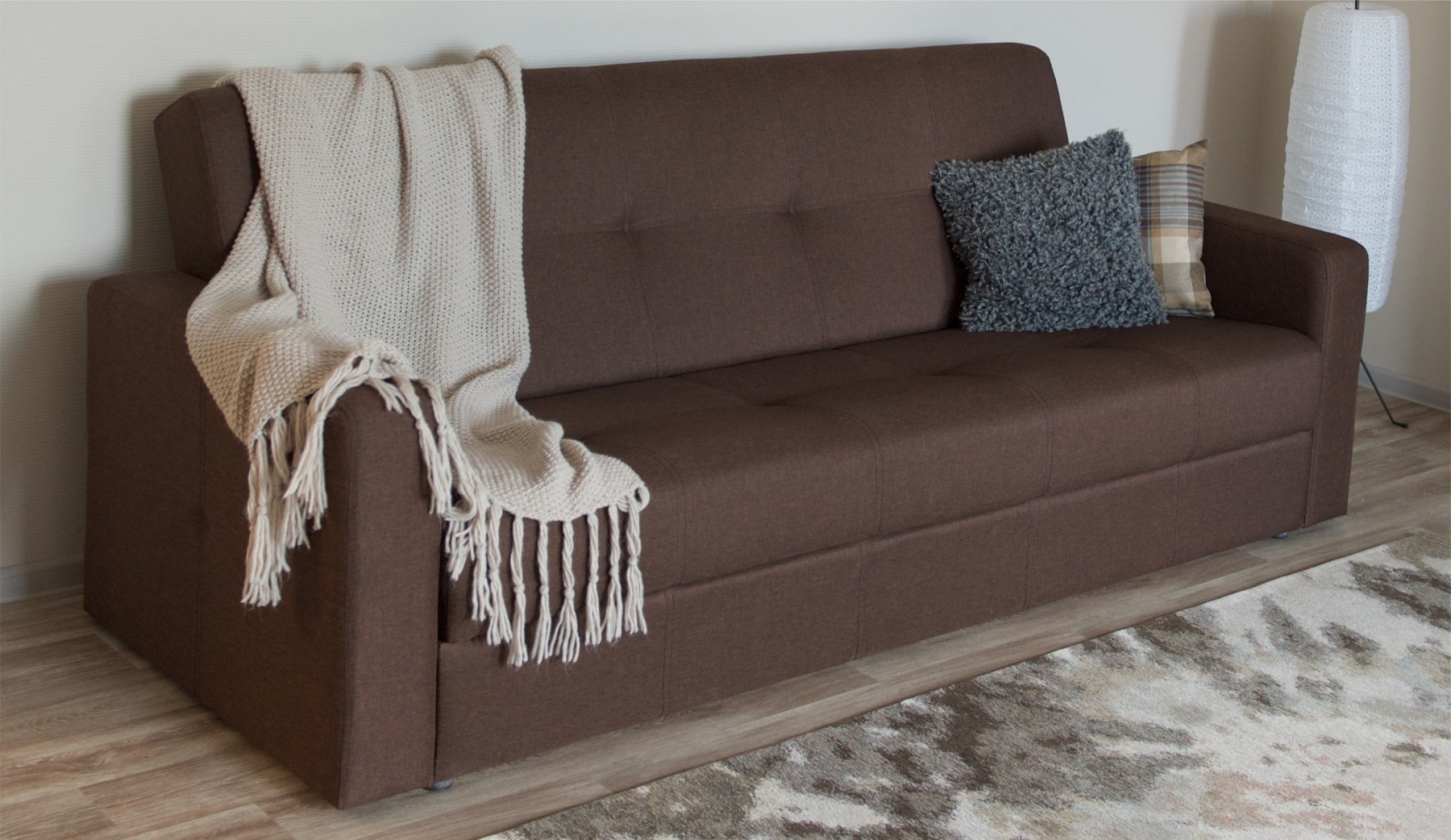 Удобный и простой механизм трансформации. Модель в светлой обивке со стяжкой.