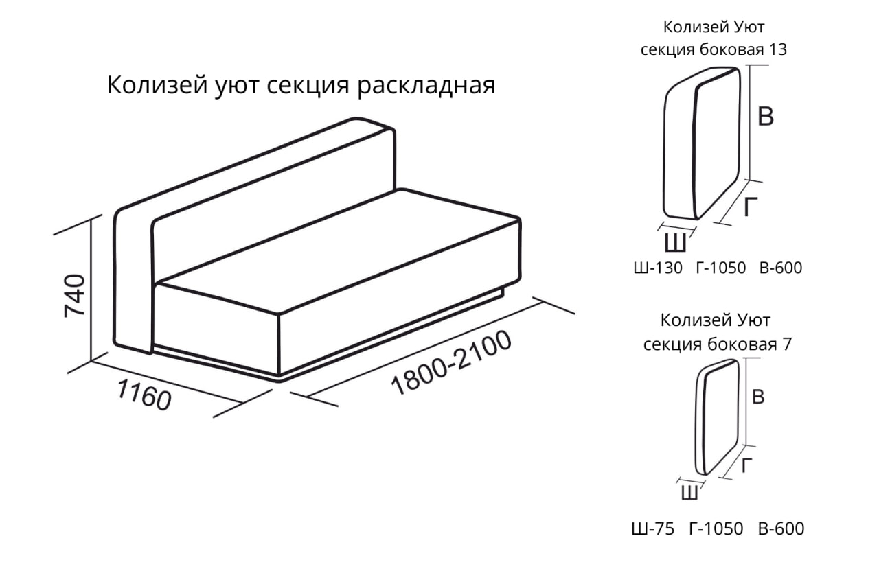 - Габаритные размеры дивана: 2150х1160 мм.