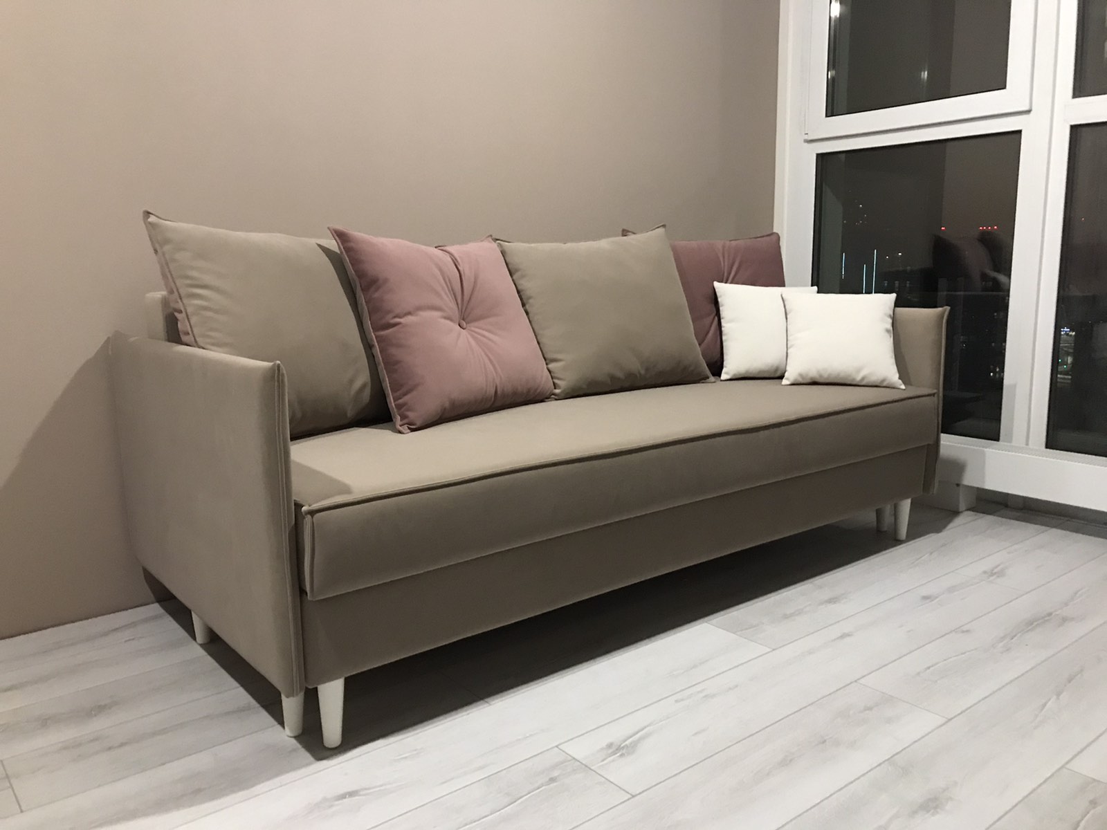 Компактный раскладной диван-«еврокнижка» с пенополеуретановым наполнителем.