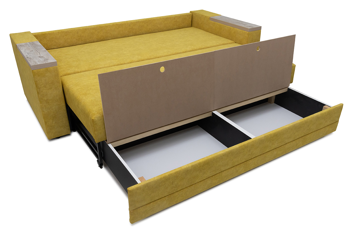 Сиденье и спинка дивана изготовлены из независимого пружинного блока, что обеспечивает комфортный отдых. В конструкции предусмотрен ящик для хранения постельных принадлежностей. В комплекте идут две подушки для спинки и одна декоративная подушка, что делает диван еще более уютным.