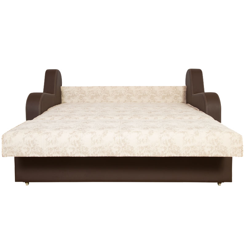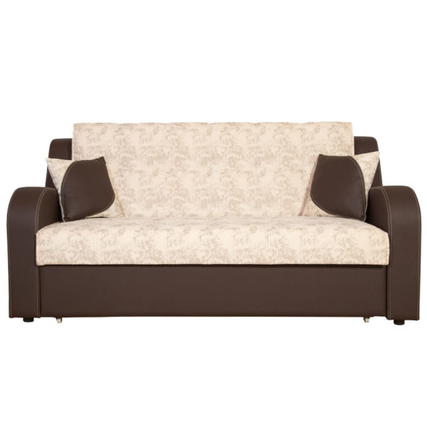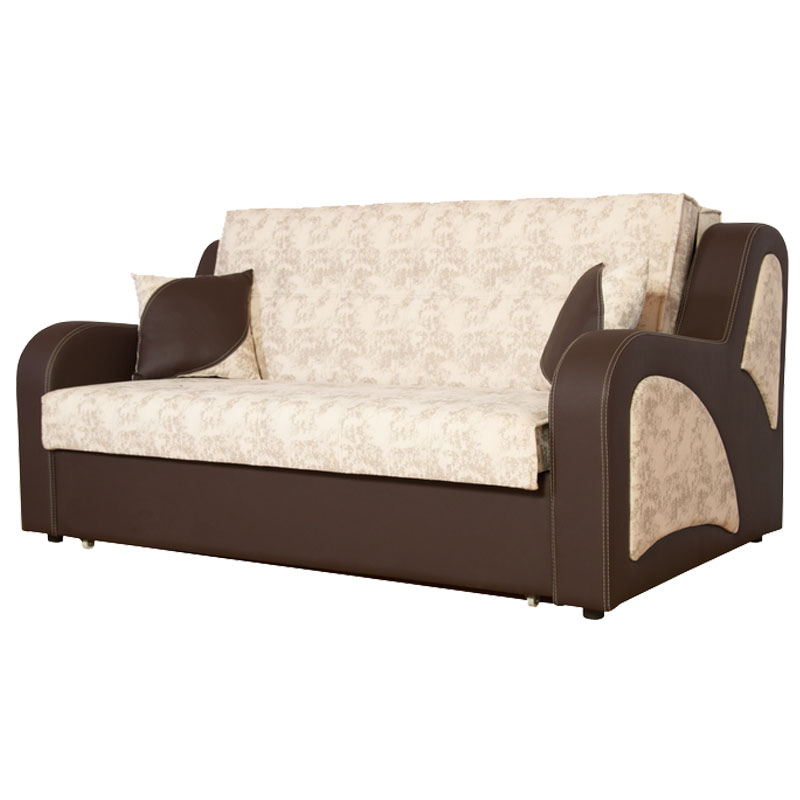 Элегантный и утонченный диван в духе современности. Мягкая обивка спинки сочетается с деревянной пластиной подлокотников благородных оттенков, декоративные вставки из ткани на боковинах из высококачественного кожзаменителя подчеркивают утонченность вкуса своего владельца. Диван легко превращается в удобную кровать при помощи выкатного механизма трансформации. Легкость и удобство в сочетании с элегантной утонченностью стиля прекрасно дополнят любой интерьер.