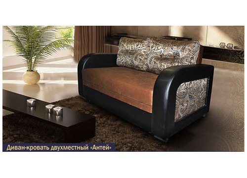 Небольшой прямой диван выполнен в ярких и темных тонах. Боковины перекливаются с подушками своим одинаковым оформлением. Раскладной механизм позволяет стать дивану комфортным спальным местом.