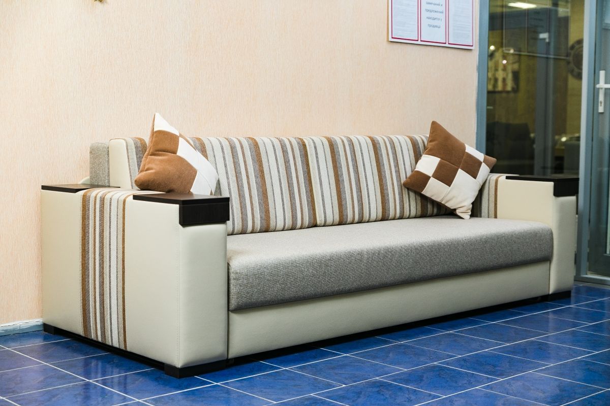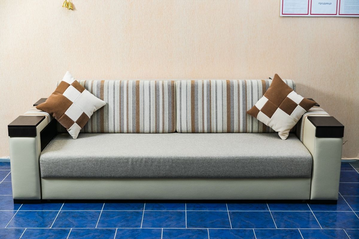 Компактный раскладной диван-«еврокнижка» с пенополеуретановым наполнителем.