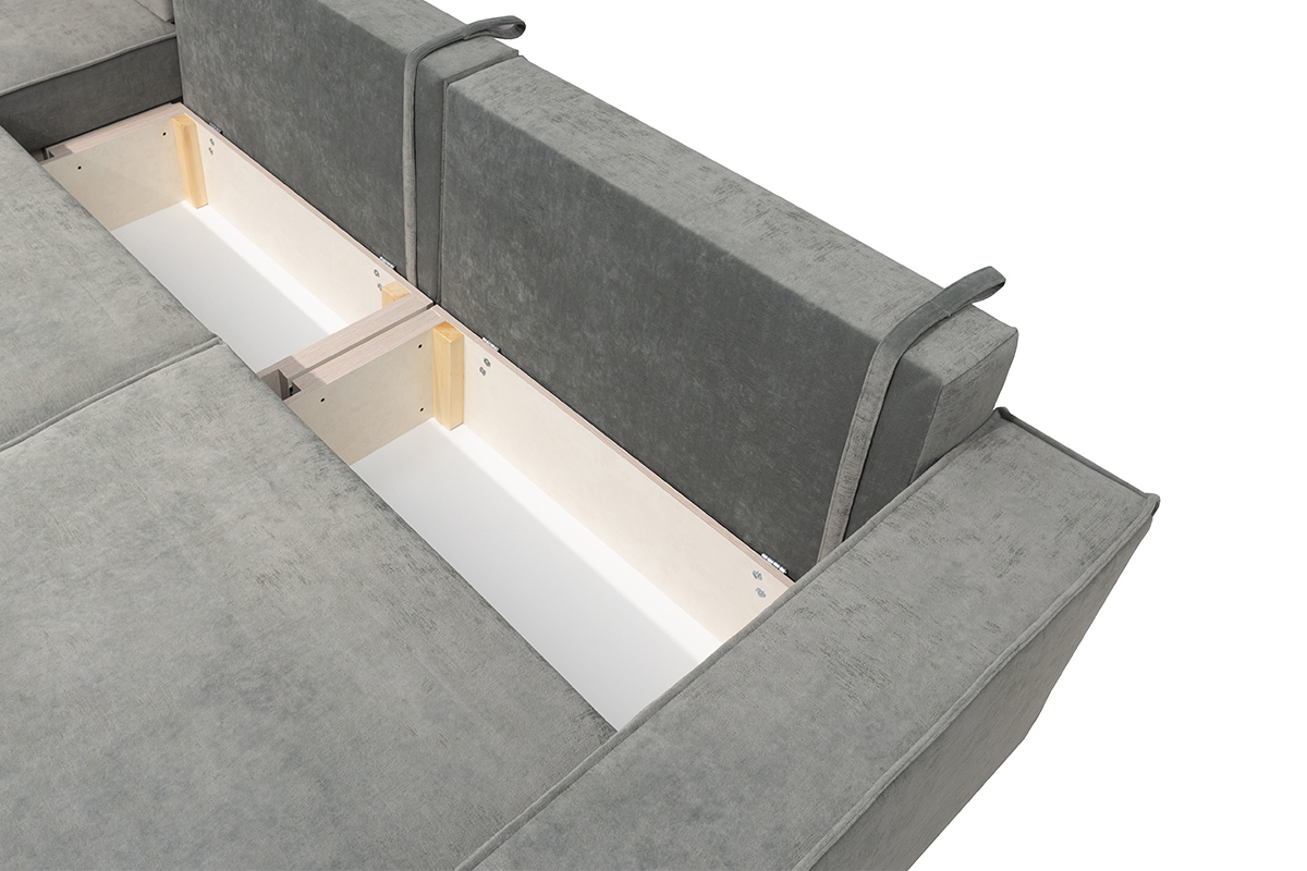 Спинка дивана на основе независимого пружинного блока + пенополиуретан. Сидение на основе независимого пружинного блока + пружинная змейка + пенополиуретан. Основание сидения и спинки – пиломатериалы хвойных пород. Имеется емкость для хранения в каждой секции.