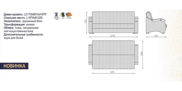 Габариты (ДхГхВ): 370х168х96 см. Независимый пружинный блок. Механизм: дельфин.