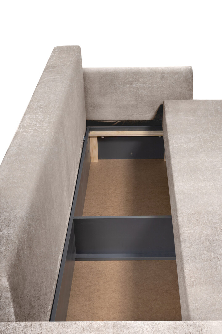Современный стиль с серой велюровой обивкой. Полки в боковинах.