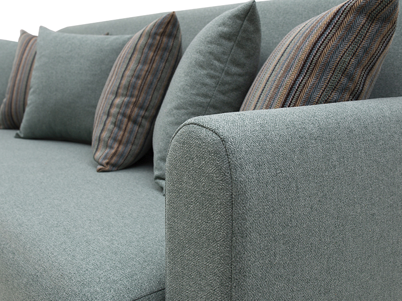 Компактный диван в мягкой светлой обивке и тонкими подлокотниками .