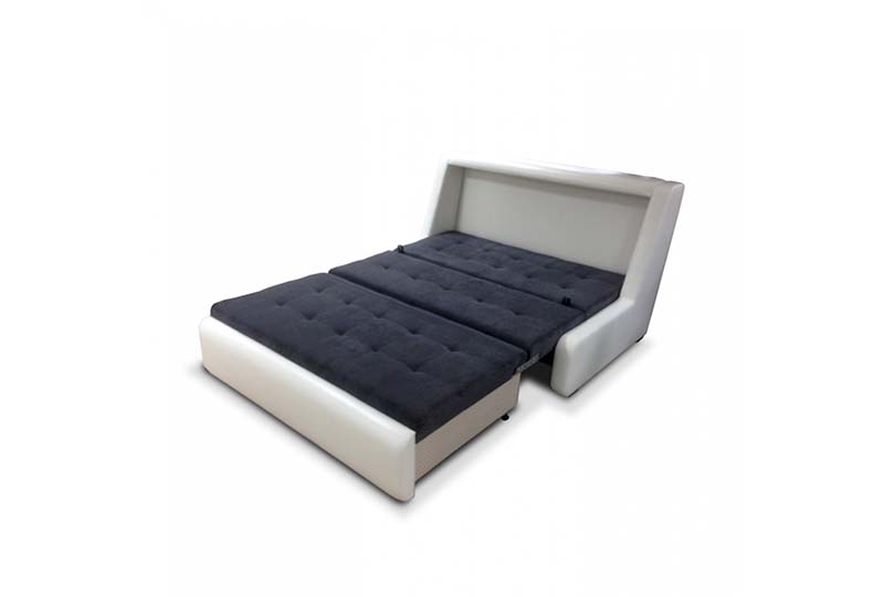 Диван-кровать «Оскар» выполнен из белой экокожи. Мягкая обивка дивана исполнена в темно-сером цвете и украшена квадратной стяжкой. Модель может раскладываться в просторную кровать.