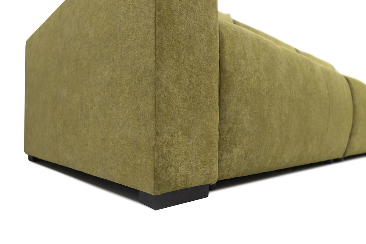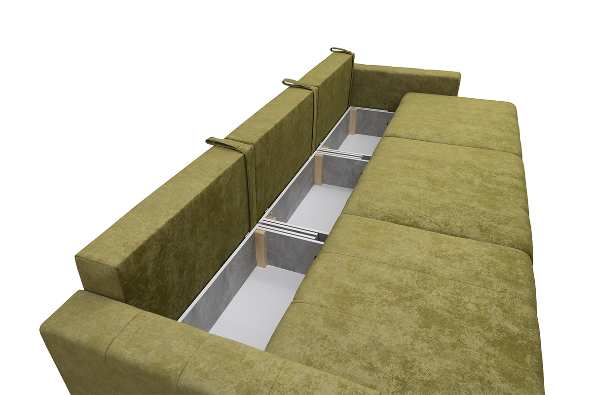 Спинка дивана на основе независимого пружинного блока + пенополиуретан. Сидение на основе независимого пружинного блока + пружинная змейка + пенополиуретан. Основание сидения и спинки – пиломатериалы хвойных пород. Имеется емкость для хранения в каждой секции. Так как каждая из секций раскладывается отдельно, то из прямого дивана можно получить угловой и даже П-образный диван.