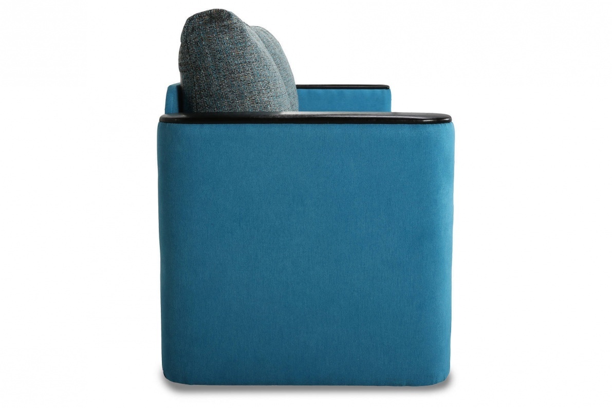 Трехместный диван эргономичой формы: узкий в профиль, при этом достаточно просторный. Подлокотники с черными жесткими накладками и закругленными внешними ребрами. Диван обит экокожей голубого аквамаринового оттенка, который гармонично сочетается с серыми подушками на спинку, добавляя в интерьер ощущение свежести и свободы пространства.