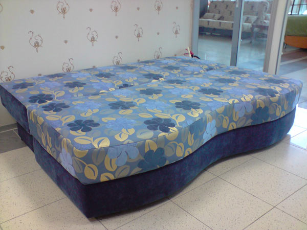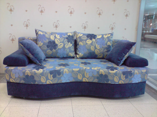 Диван-кровать обладает интересным волнистым дизайном. В комплекте идут две подушки, а также два валика, играющие роль подлокотников. Обивка декорирована цветочными узорами. Модель раскладывается при помощи механизма трансформации «еврокнижка».