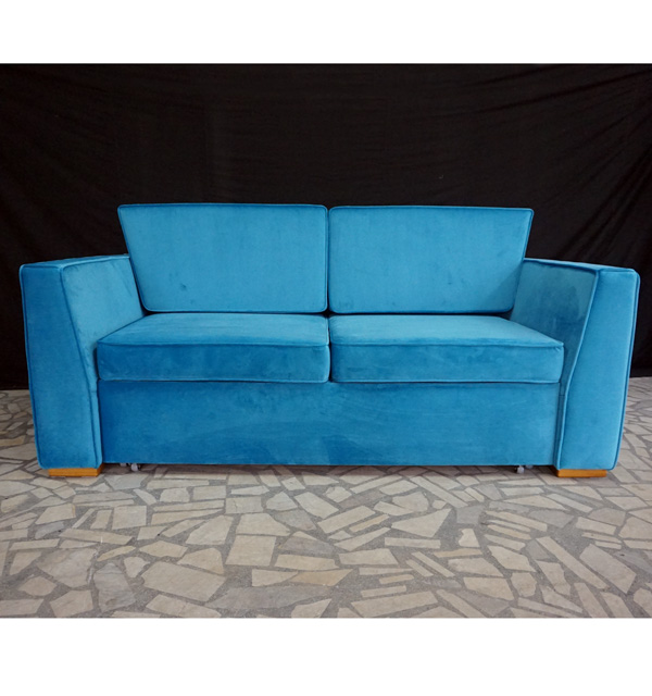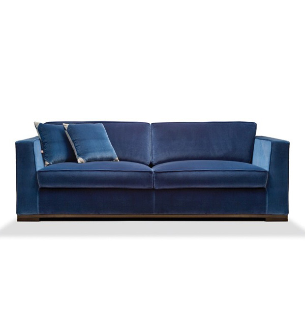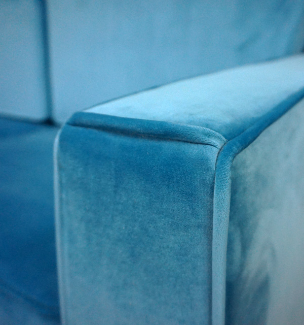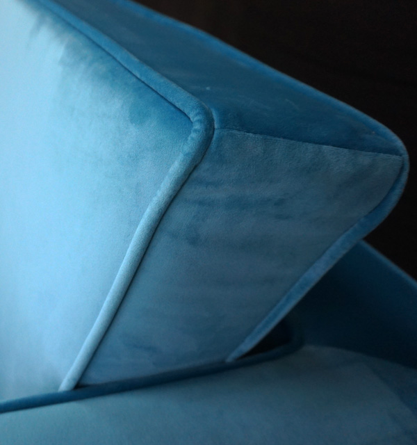 Спинка трапецией и слегка отогнутые с внутренней стороны прямоугольные подлокотники создают иллюзию, будто этот симпатичный диван сделан из мармелада, а лазурно голубая расцветка бархатистой обивки напоминает цвет морской волны, что отображено в названии. Мягкие эластичные пуфы делают сиденье максимально комфортным при глубокой посадке и условно делят ложе на две половины, как и мягкие модули спинки. Кромки всех элементов декорированы кантом.