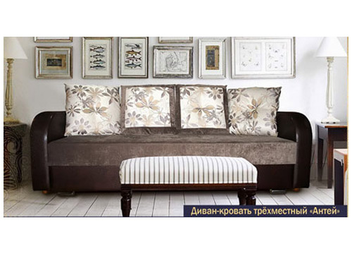 Комфортное удобное место для отдыха и сна. В комплекте четыре декоративные подушки, диван выполнен в коричневатых оттенках. Обивка приятна на ощупь, материалы долговечны. Ножки неординарной формы изготовлены из металла.