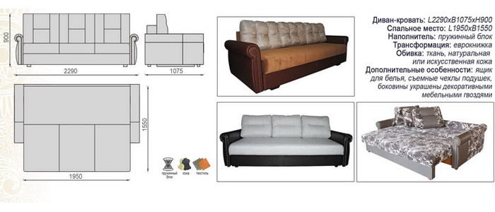 Классической формы диван подойдет для гостиной комнаты. С легкостью трансформируется в удобное спальное место. Обивка имеет цветочный приятный узор.