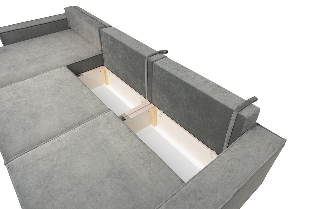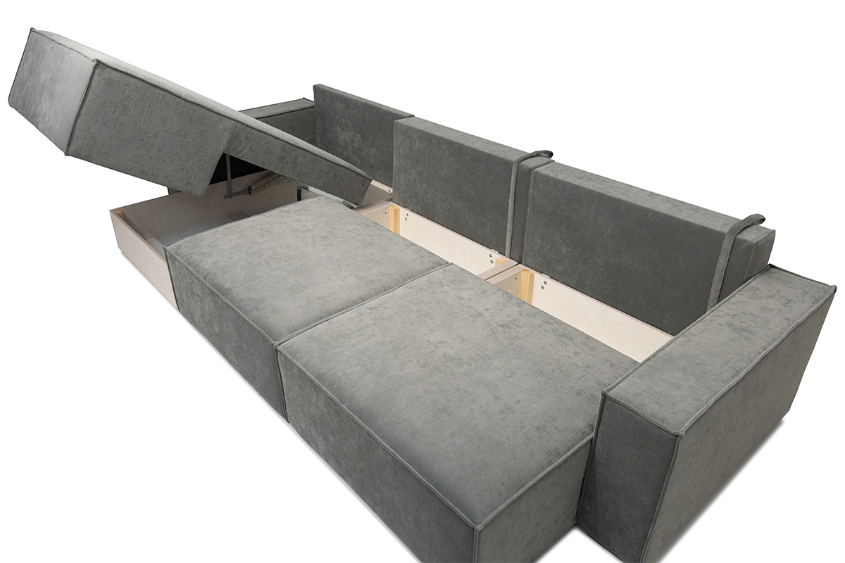 Спинка дивана на основе независимого пружинного блока + пенополиуретан. Сидение на основе независимого пружинного блока + пружинная змейка + пенополиуретан. Основание сидения и спинки – пиломатериалы хвойных пород. Имеется емкость для хранения в каждой секции.