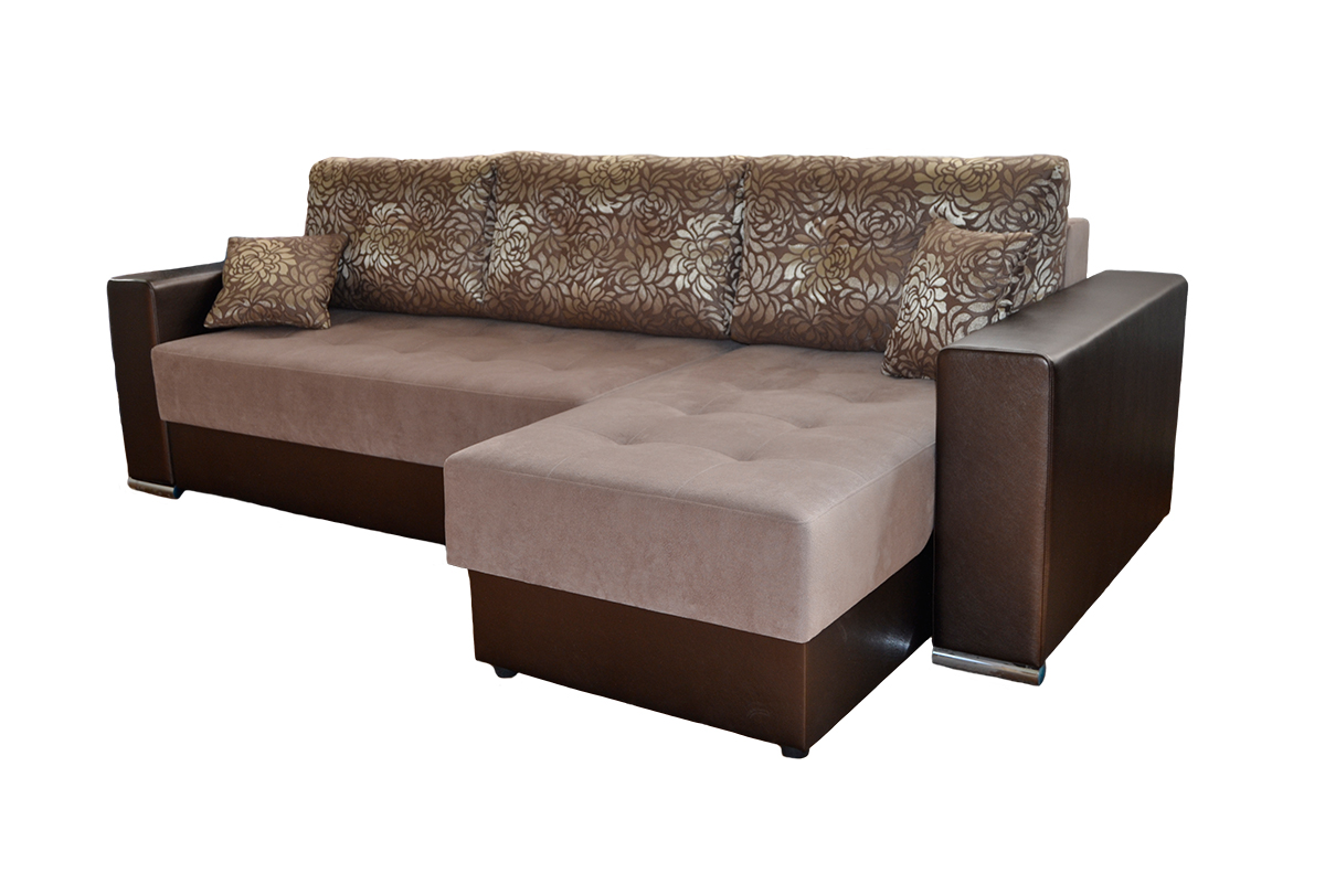 Функциональный угловой диван с "аппетитными" формами и расцветкой. Основание и прямоугольные подлокотники обиты в темно-коричневой экокоже шоколадного оттенка, сиденья с выступающим сегментом в бежевом бархате точечной стяжки. Три широкие подушки в ткани с полуглянцевым цветочным рисунком комфортно смягчают невысокую спинку.