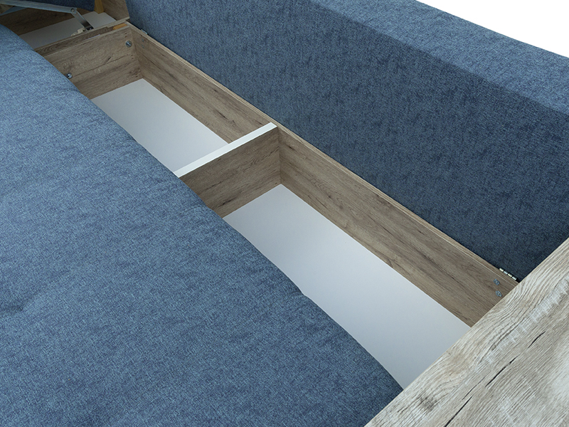 Диван оснащен механизмом раскладки и вместительным ящиком для белья.